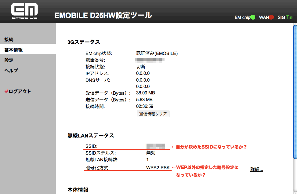 再び Pocket WiFi の無線 LAN に接続できるようになったら、(1−1) → (1−2) の手順の後、左側のメニュー項目にある「基本情報」をクリックします。すると emobile SIM の情報とともに、簡単な設定内容も表示されます。