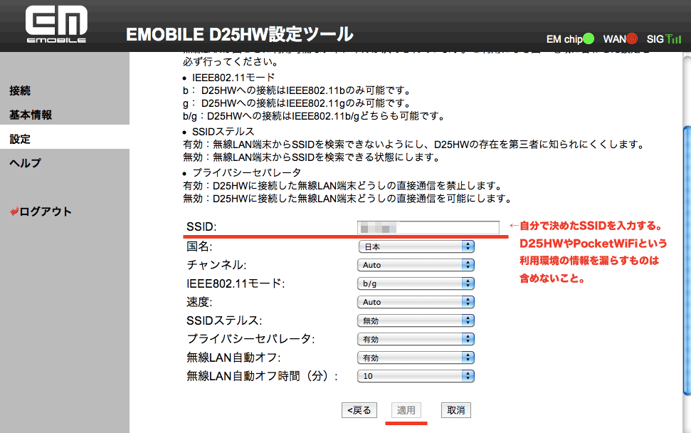 ただし、せっかく D25HW という文字を外したのに「Pocket WiFi」などと使ってる機種が判るような SSID は変更が無意味になりますし、パスワードと同じ SSID なんてのは、もってのほかですので、それだけは気をつけるべき点です。