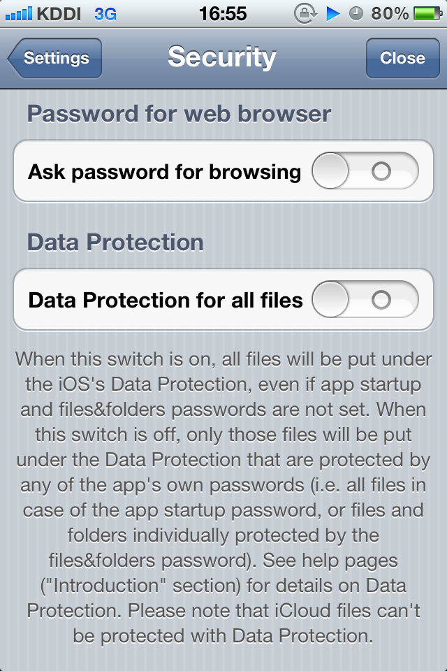GoodReader の中に秘密にしたいファイルを入れる時は、iPhone 本体および GoodReader にパスコードロックをかけた上で、「Data Protection for all files」機能も ON にして、iCloud には置かずローカルファイルとして保存しておくべきですね。