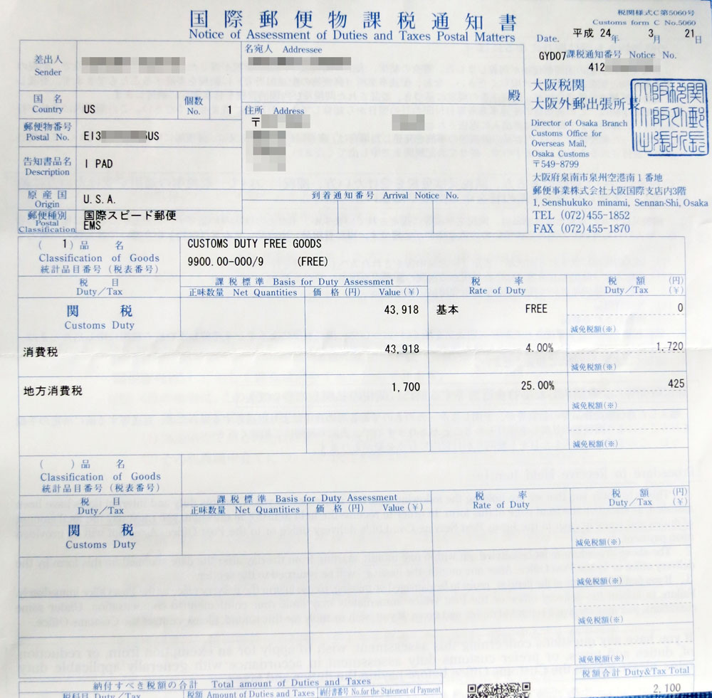 ちなみに iPad は関税はかかりませんが、消費税はしっかり取られました。消費税、地方消費税あわせて 2,100円。あと EMS の通関手数料が 200円の合計 2,300円が別途支払いになりました(なお、本体代金は送料込みでソフトバンク版+1万円です)。