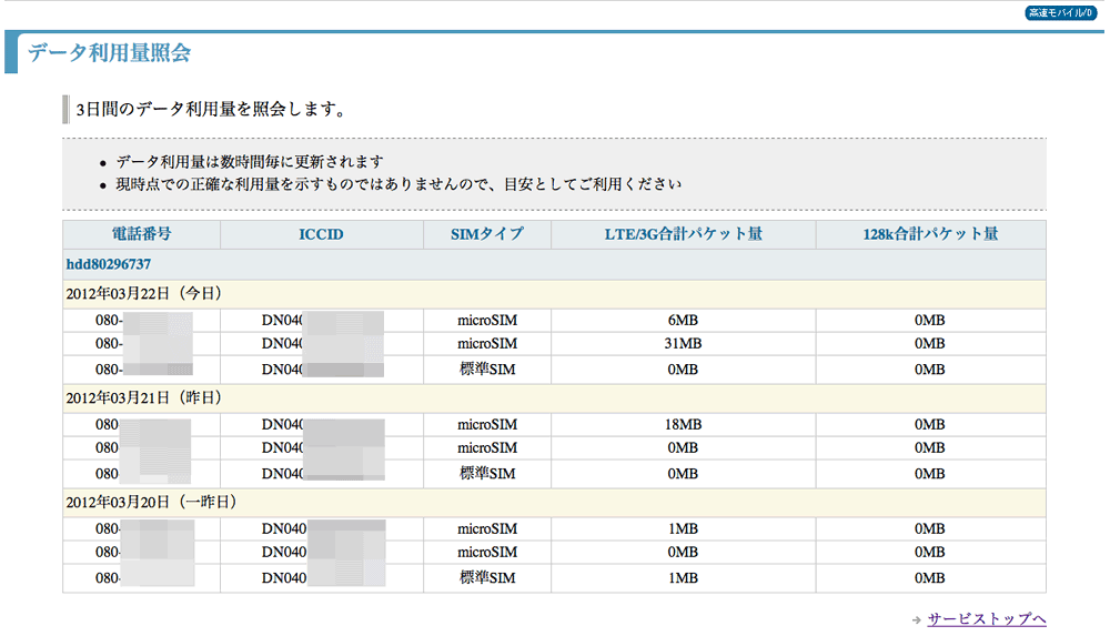 それでも IIJmio 高速モバイル/D の場合は、管理画面で直近3日間の日毎データー通信量が表示されるので、それで自分の通信量を把握しながら使えるというのはメリットだと思います。