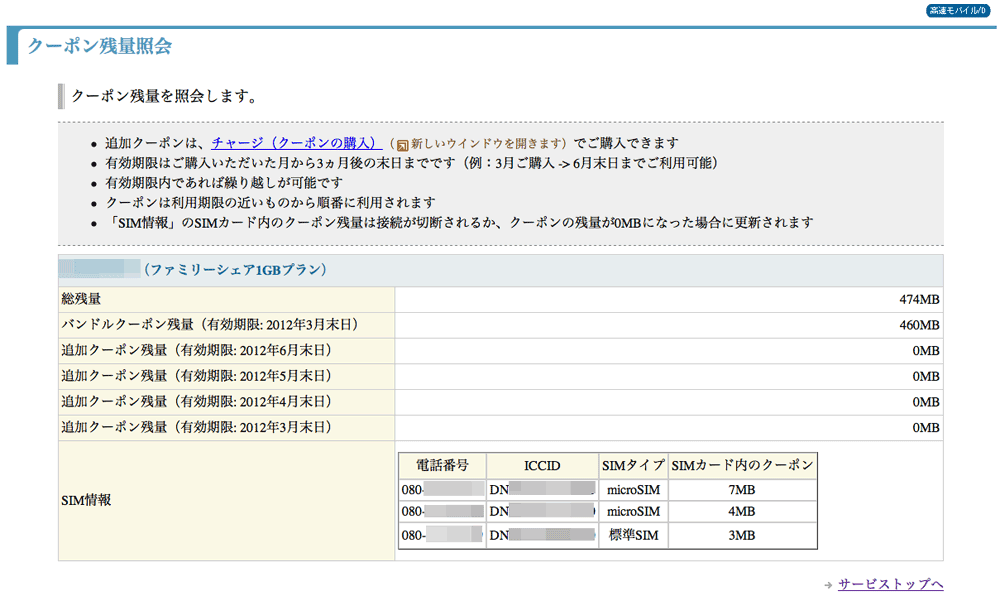 のは事実ですし、追加チャージ(クーポン)は 100MB 525円と少々割高になっていますから