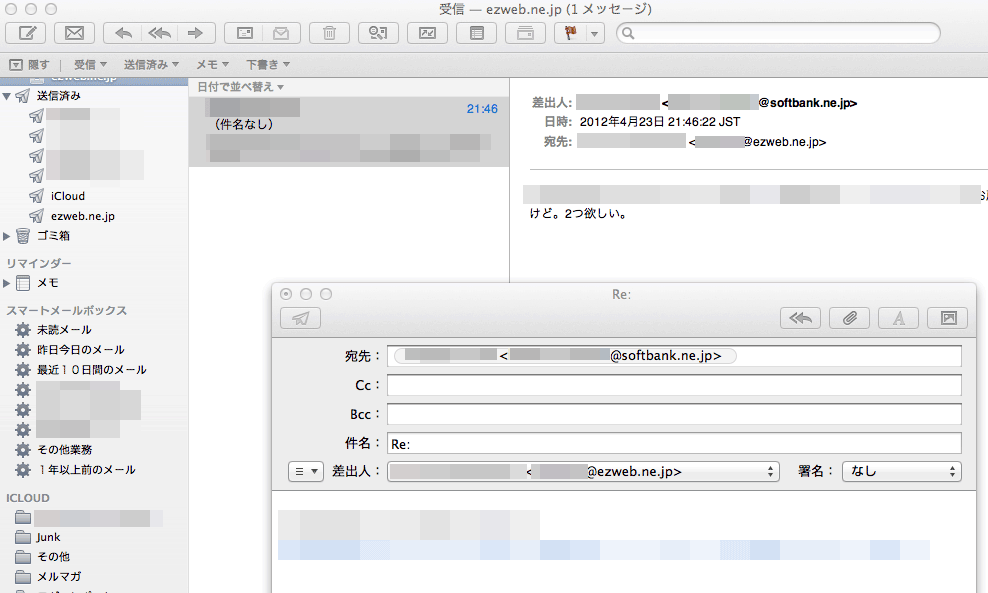 【9/14, 10/5 追記】上記1から4の作業を行なって Mac で受信可能な状態にすると iPhone で ezweb メールを受け取れなくなる場合があるようです(私も経験してますが)。