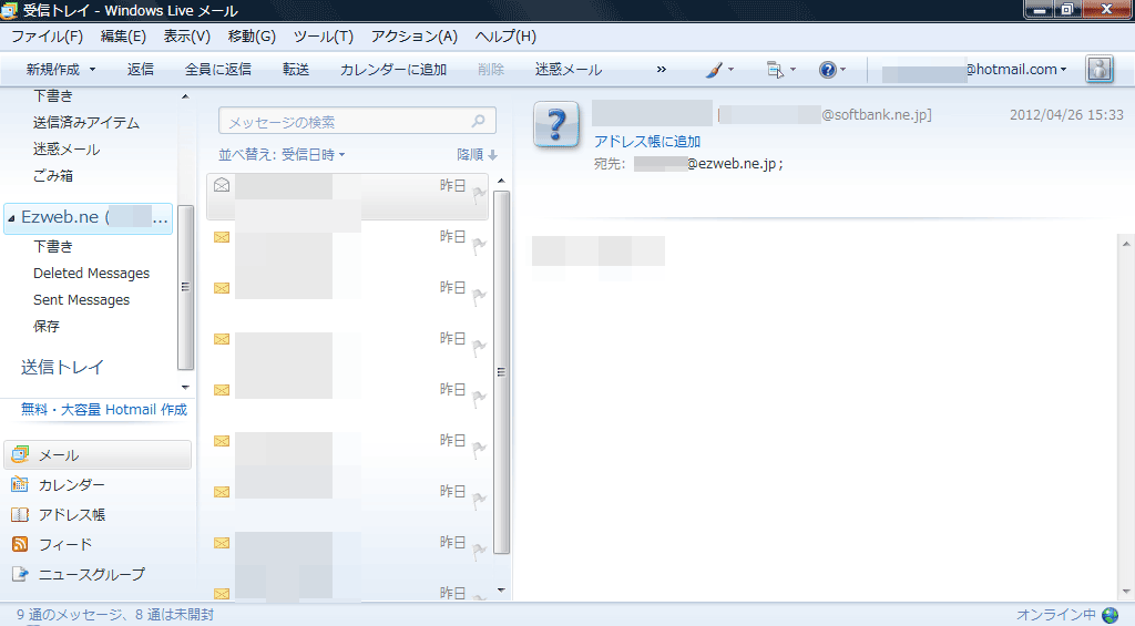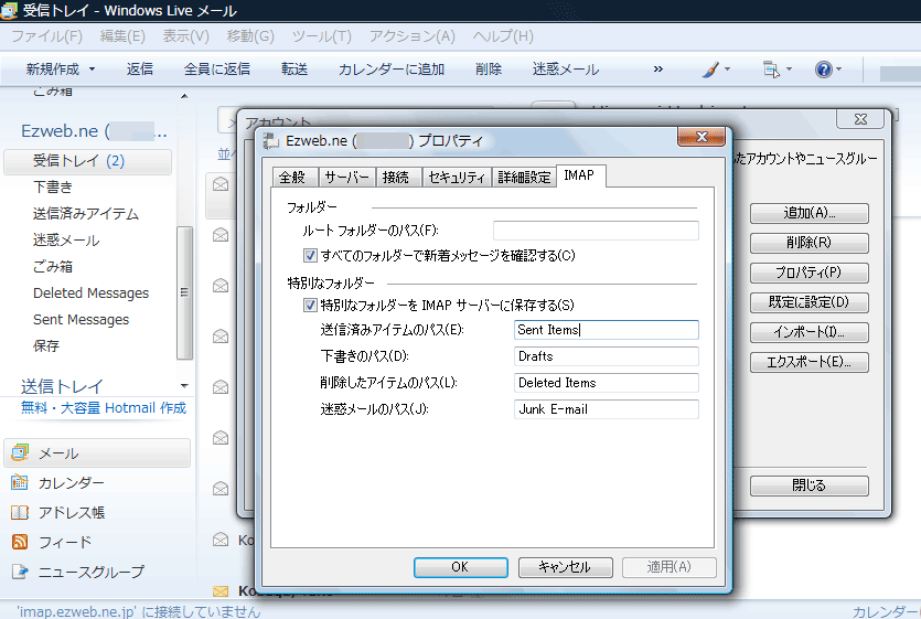 正確に設定が終われば、IMAP のフォルダを読み込みするボタンが表示され、それをクリックすると以下のように Windows Live メール上で au キャリアメール (ezweb.ne.jp) の送受信が可能になります。