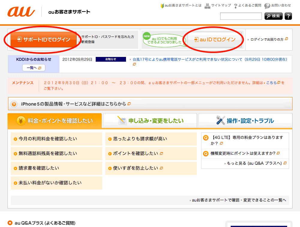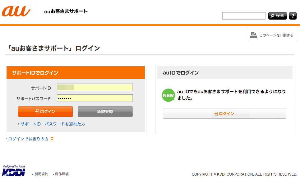 ※ サポートID、au ID のどちらでログインしても、以下の同じ画面へ移動します。