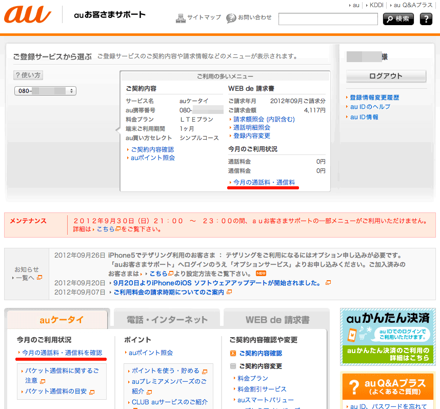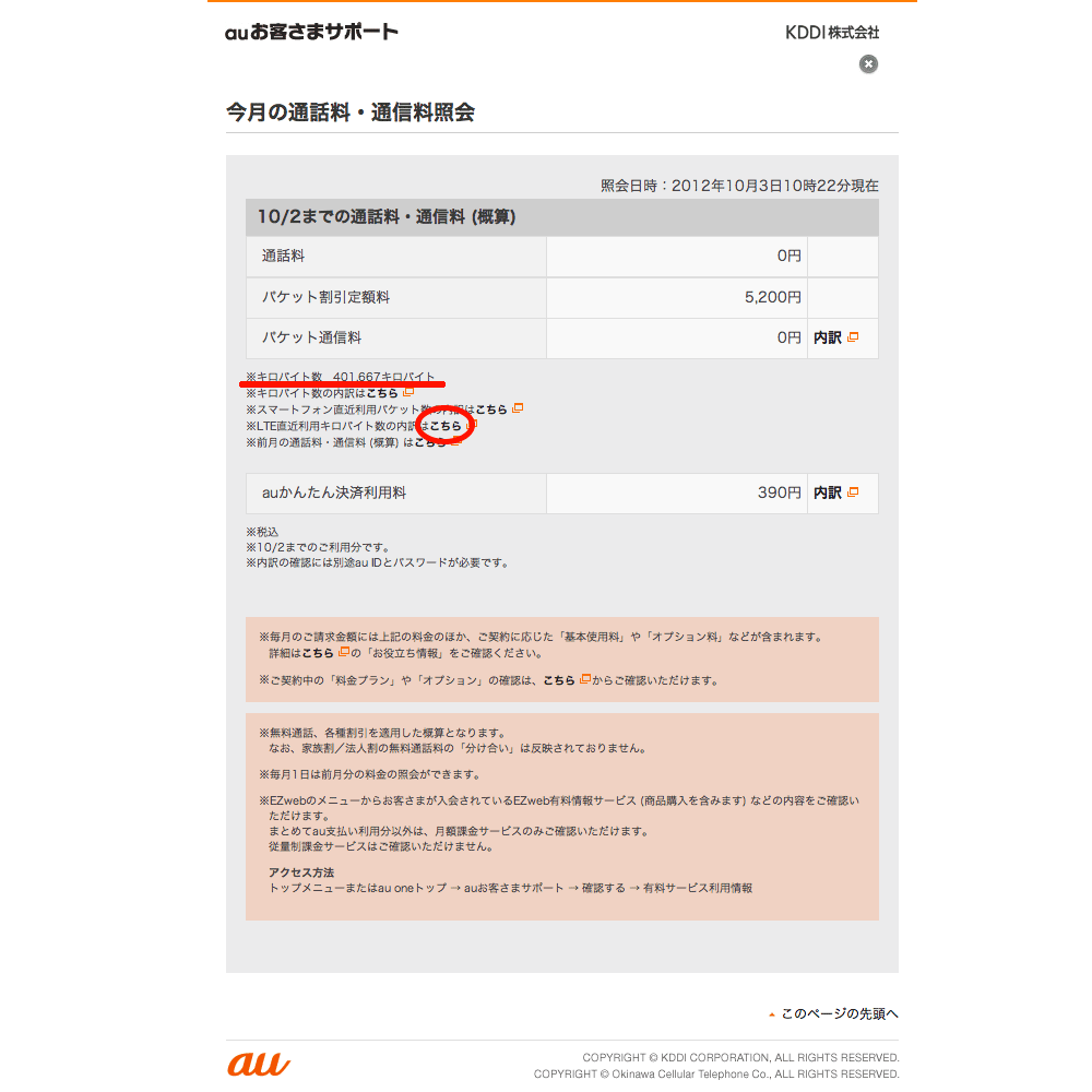 【10/18 追記】「auお客さまサポート」アプリが LTE プランに対応しましたので、本記事のように Safari から au へログインして閲覧しなくても、アプリの更新ボタン一発で当月の通信量、直近の通信量が判るようになりました。