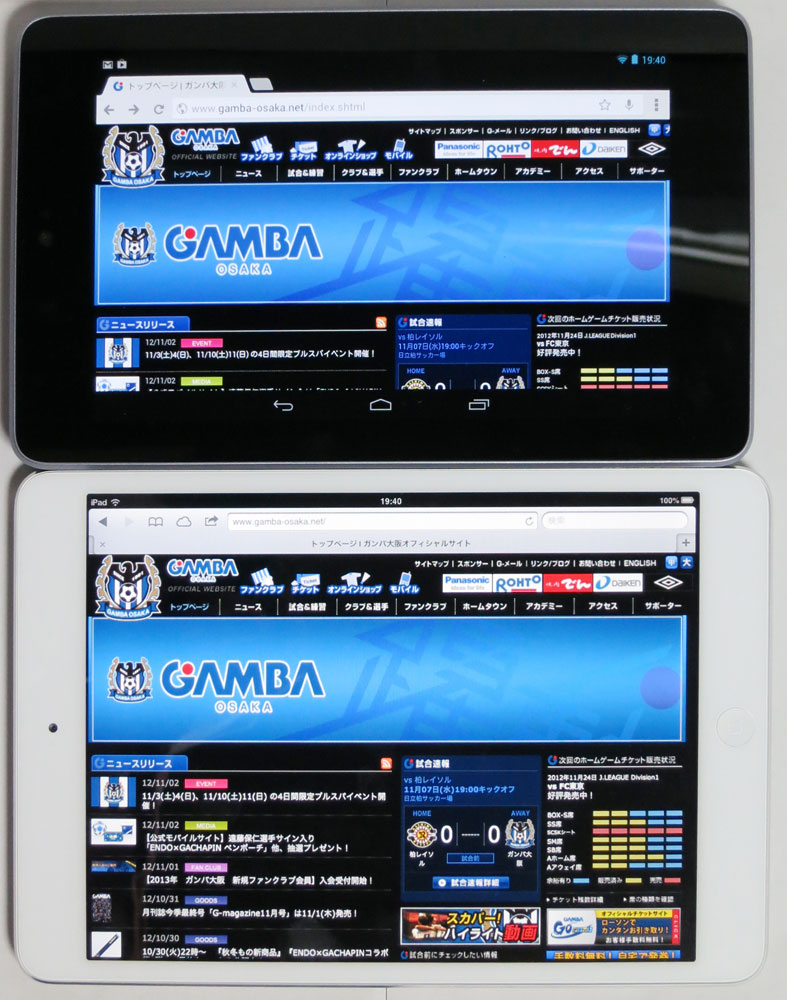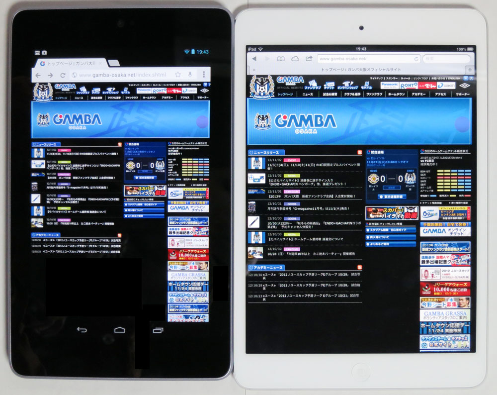 しかし、このことは諸刃の剣です。4:3 の比率が良いことばかりでもありません。上記の写真を見てもらっても判るように、筐体サイズも明らかに iPad mini は幅広です。