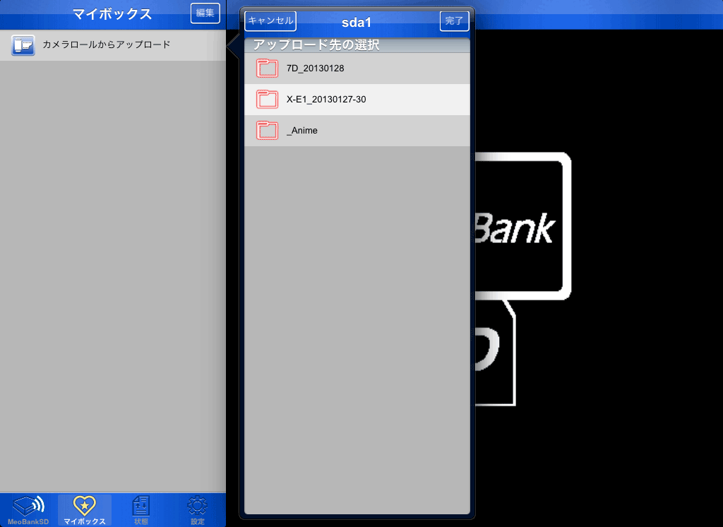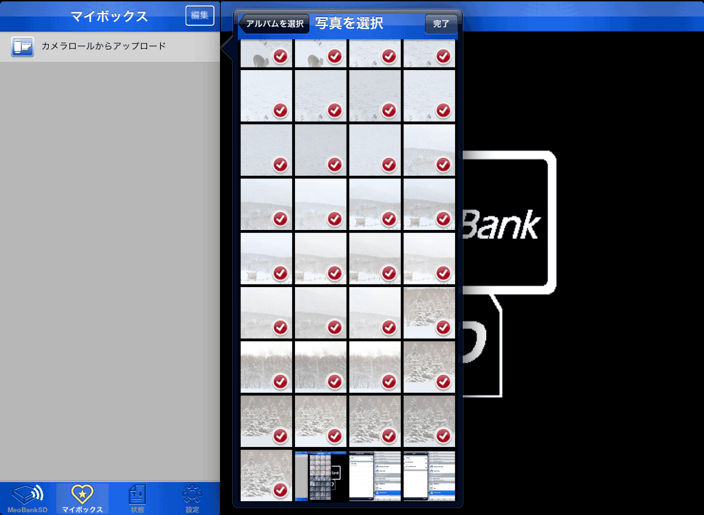マイボックスタブからアップロードを選んで、ライブラリ内の写真を選択して完了をタップ)