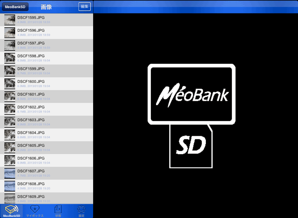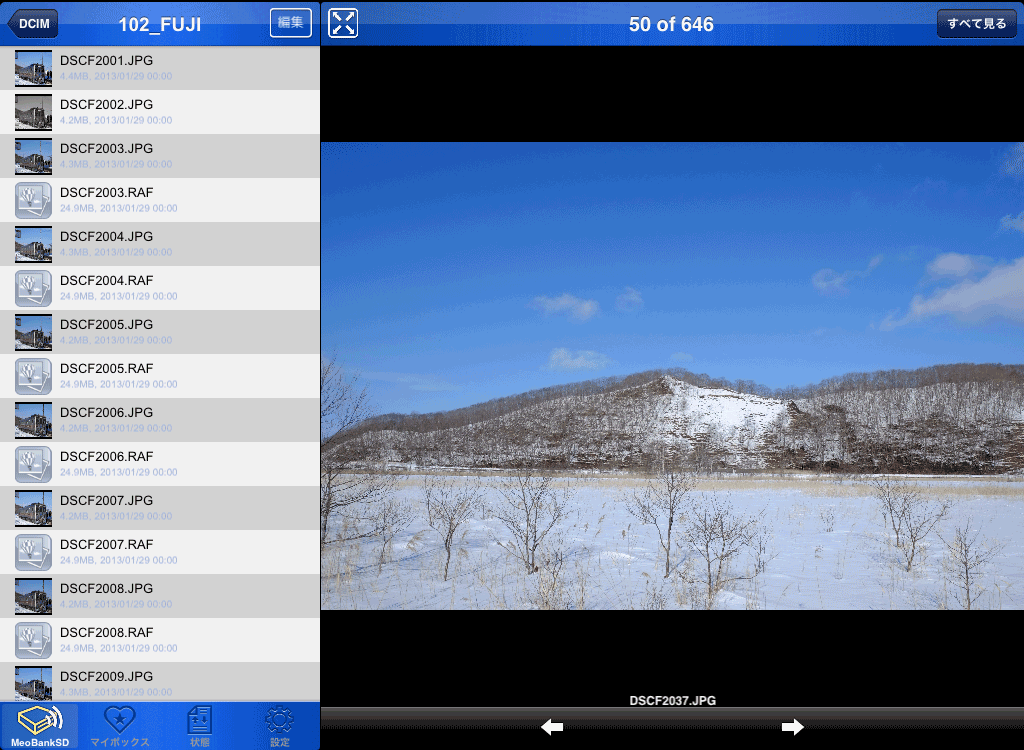 (iOS アプリでは JPEG はサムネイル表示あり。タップするとファイルが読み込まれて右に表示される)
