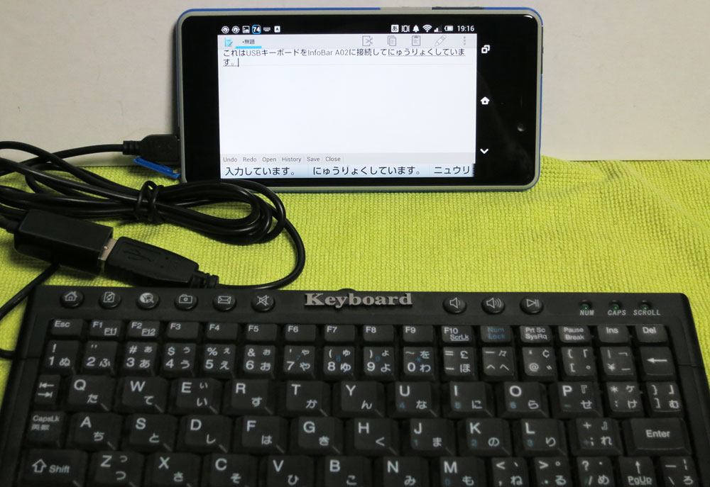 USB ホストケーブルに USB キーボードを挿して、INFOBAR の microUSB 端子に挿してみると…