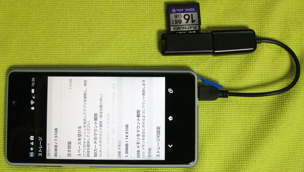 まずは、この USB ホストケーブルに、百均の小型 SDカードリーダー(以前ローソン100で売っていたもので結構愛用している)を接続して、SDHC カードが読み書きできるか確認してみました。