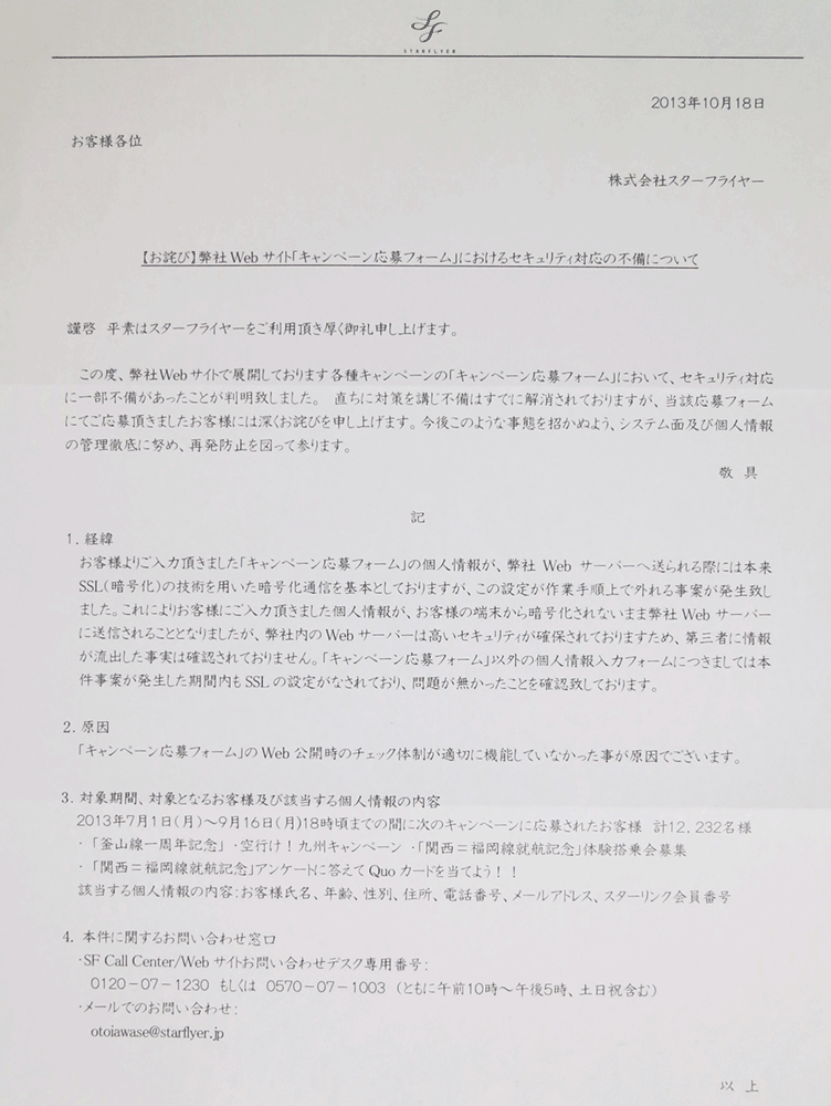 また数日前には突然スターフライヤーから封書が届いて、何かと思ったら「セキュリティ不備に関するお詫び」の手紙でした。