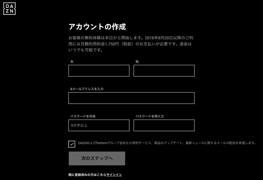 (DAZNユーザー登録画面の1画面目。姓と名が逆であることに注意。