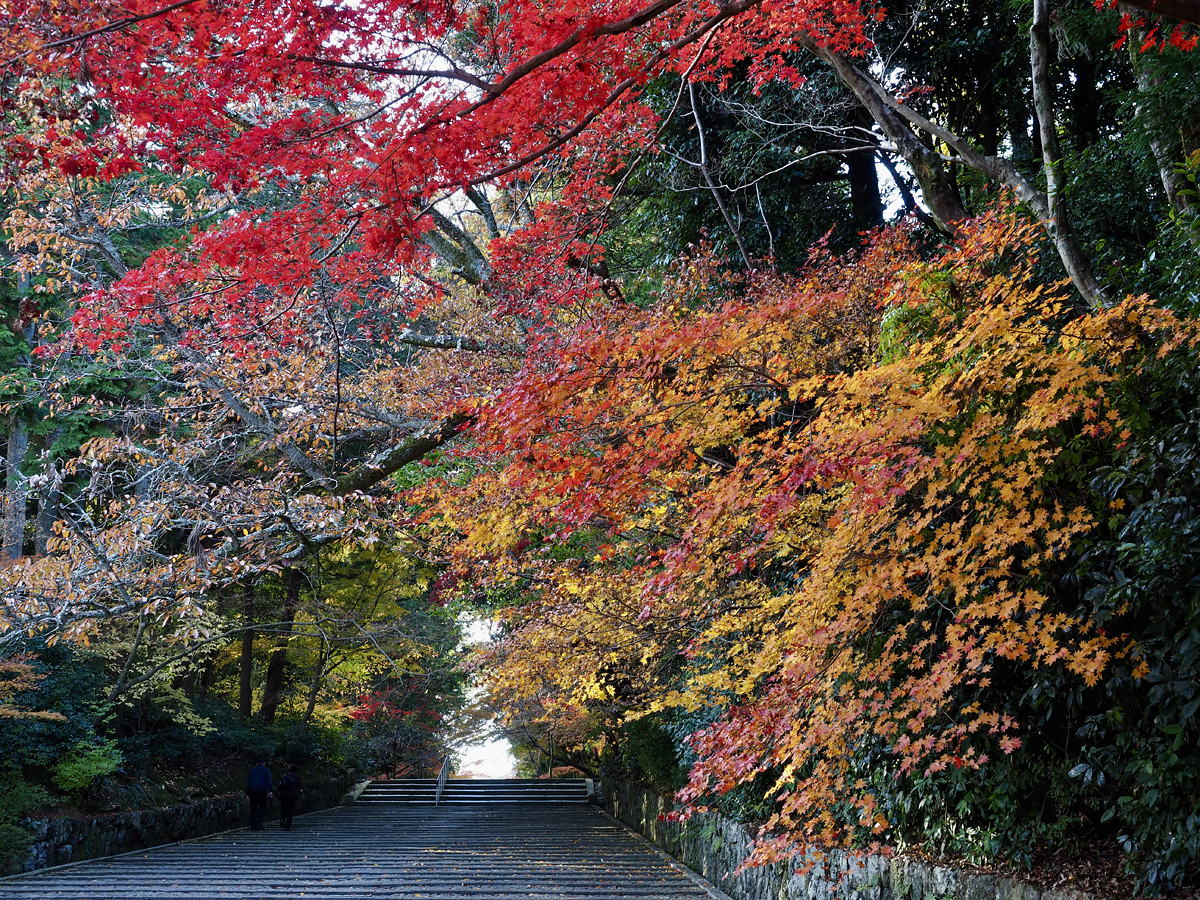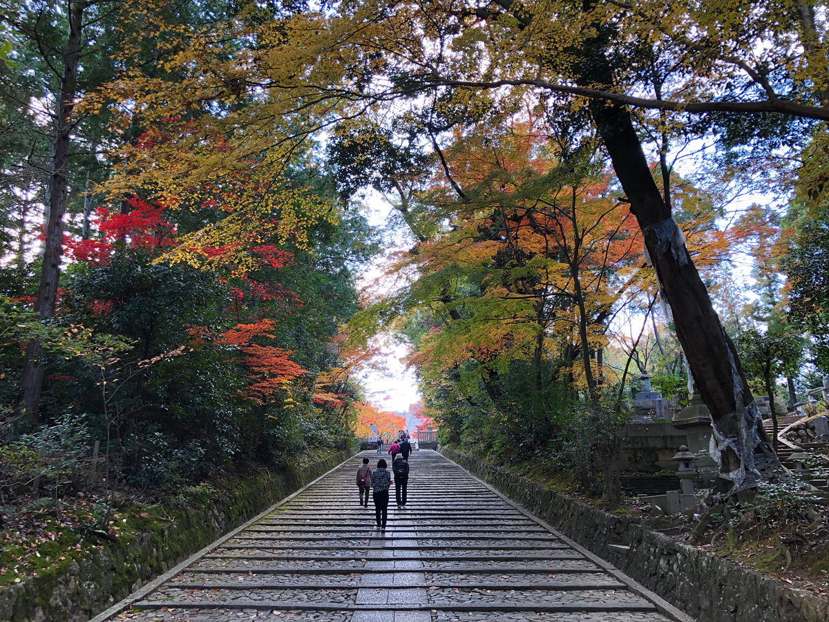 そして総門をくぐると広い表参道の階段が見え、両側にカラフルに染まった木々がありますが、こちらはまだオードブル。メインディッシュの「もみじ参道」は帰り道です :-)
