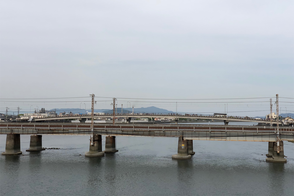 1600 R188 を岩国駅へ向かって今津川の橋に差し掛かる。こちらへくるのは地元民とか、せいぜい駐車場方面の人のようで、駅に近づくにつれ、人が減る。