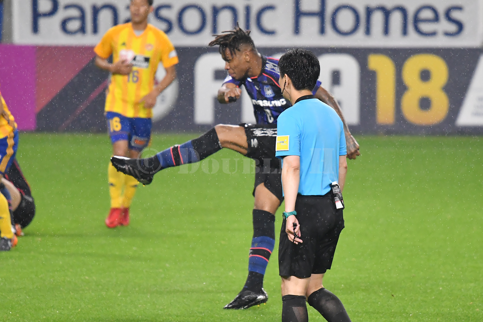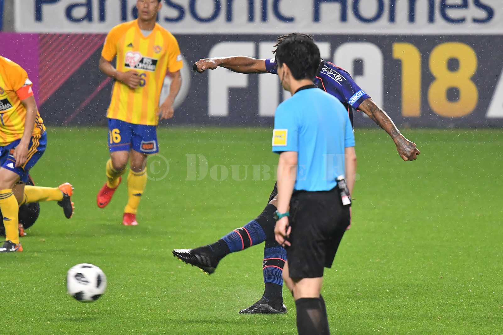 2コマ目3コマ目はもちろん、完全にかぶられている最後のコマも捨てる写真ではありますが、ダイナミックAF だと、とっくに手前の38番ないし白の19番の選手にフォーカスが引っ張られてしまう状況。だけど 3D-トラッキングAF は食いついたまま離さない。