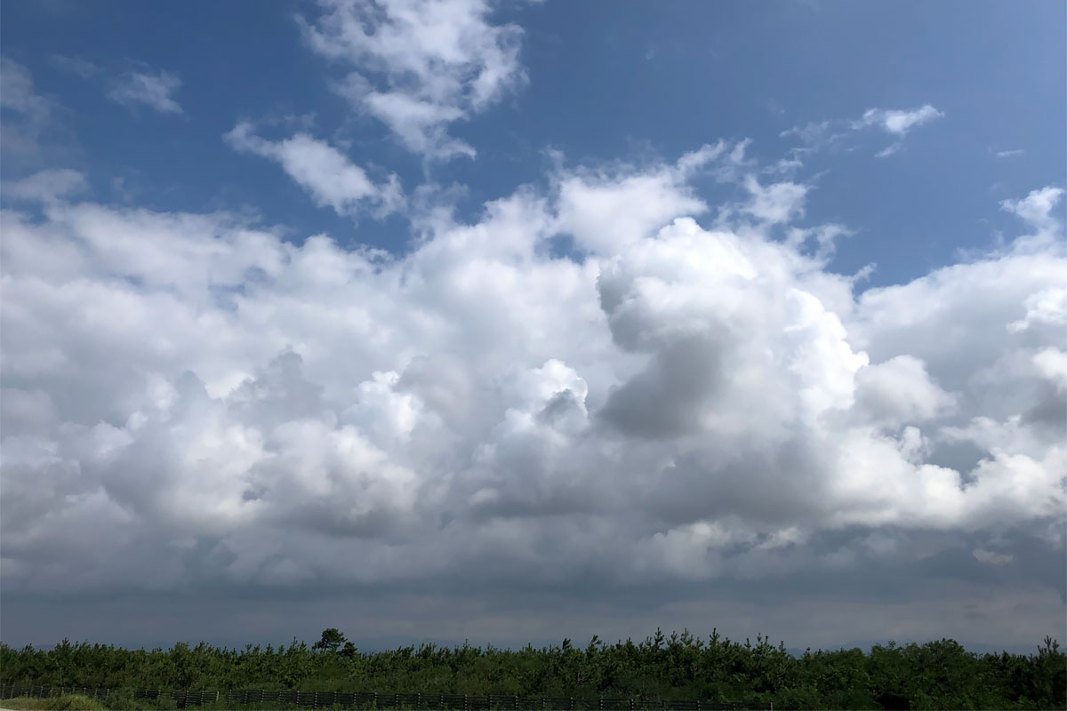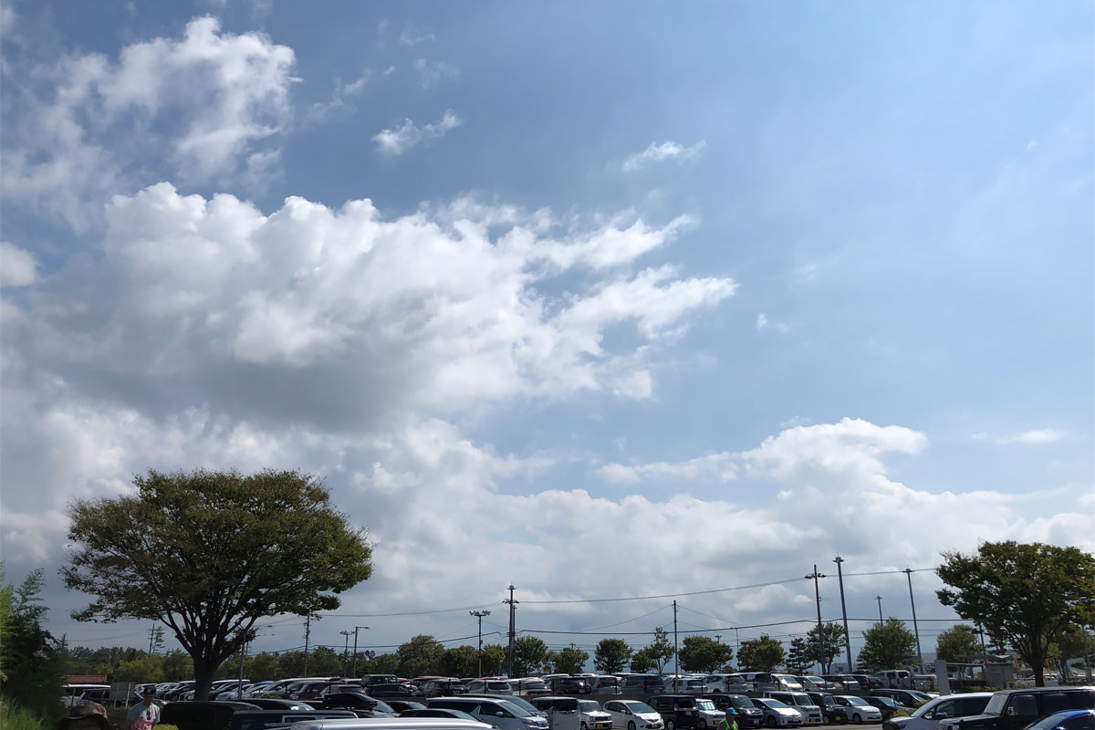 陸地側から進出してきた雲が海上でウロコ雲を形取っていく頃、ブルーインパルスの展示飛行は終了。即座に機材をバッグに収納して、自転車頑張って漕いで臨時駐車場へ。