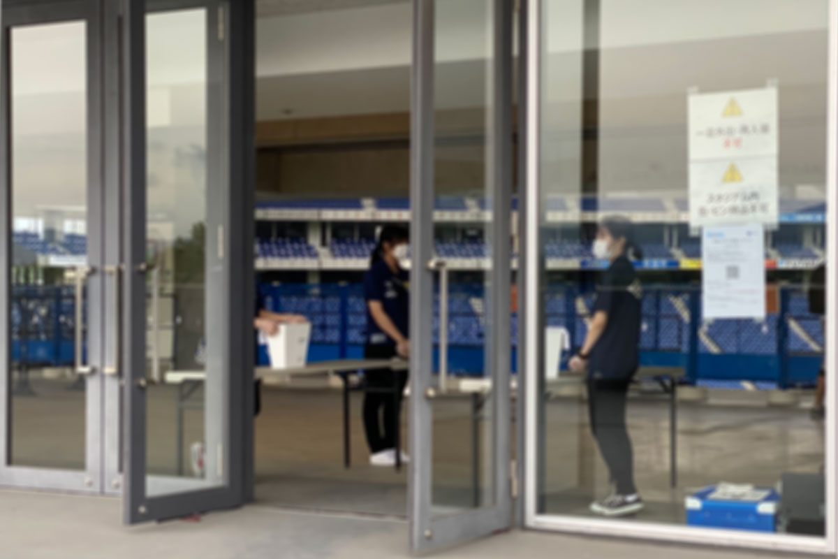 入場時には、スタジアムへ入る各ゲートの階段下でまず検温があり、スタジアム入り口のチケットチェック時もチケットの半券は自分でもぎって自分で半券回収箱に入れる手順になっていました。(入場時もチケットは見せるだけ)