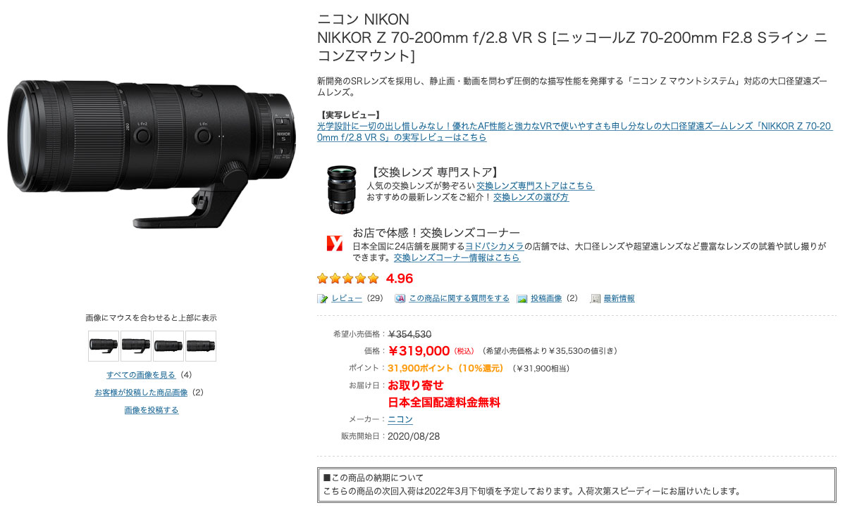 主力レンズになる予定の Z70-200mm f/2.8 VR S に至っては3月下旬入荷予定とあって、さすがに「はあ?」って感じであります。(↓)