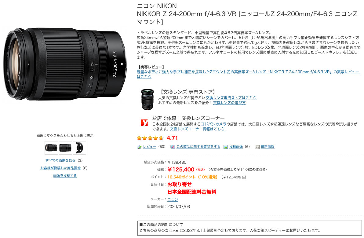 とりあえずまず1本買おうと思っていた Z 24-200mm f/4-6.3 VR がヨドバシカメラで3月上旬入荷予定。(↓)