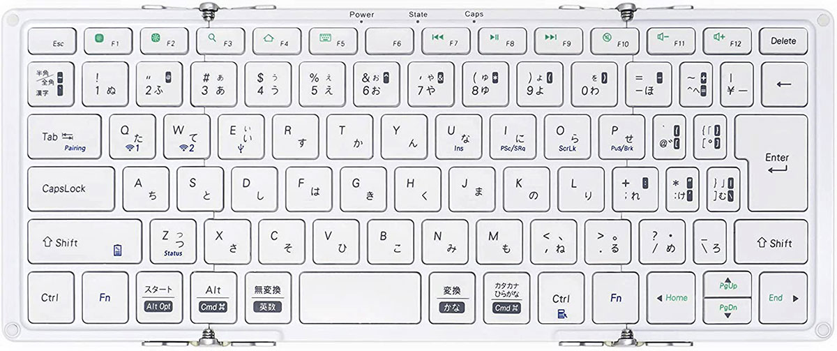 3つ折りタイプで、キーピッチは右側の記号キーを除けば 19mm フルピッチ。その分、開いた時だけでなく折り畳んだ時も大きめ&厚めだし、三つ折りヒンジ部にある突起はタイプ時に手に当たって気になるだろうけど、Enter キーは大きな逆L字タイプだし、英数/かなキーで言語切り替えできるのはかなり魅力的。