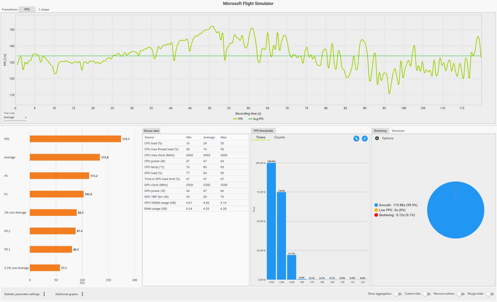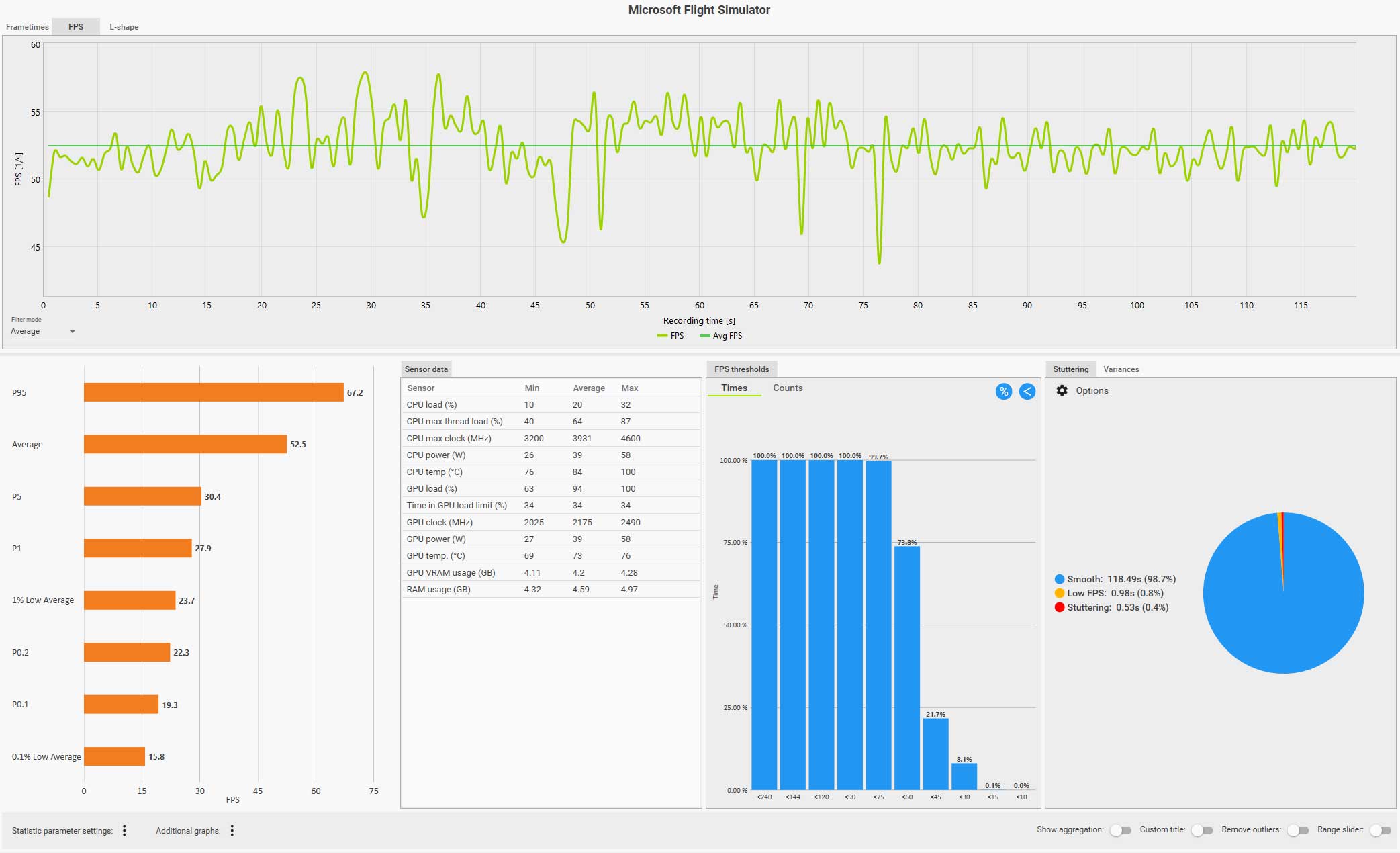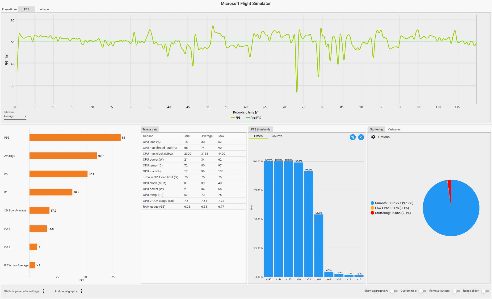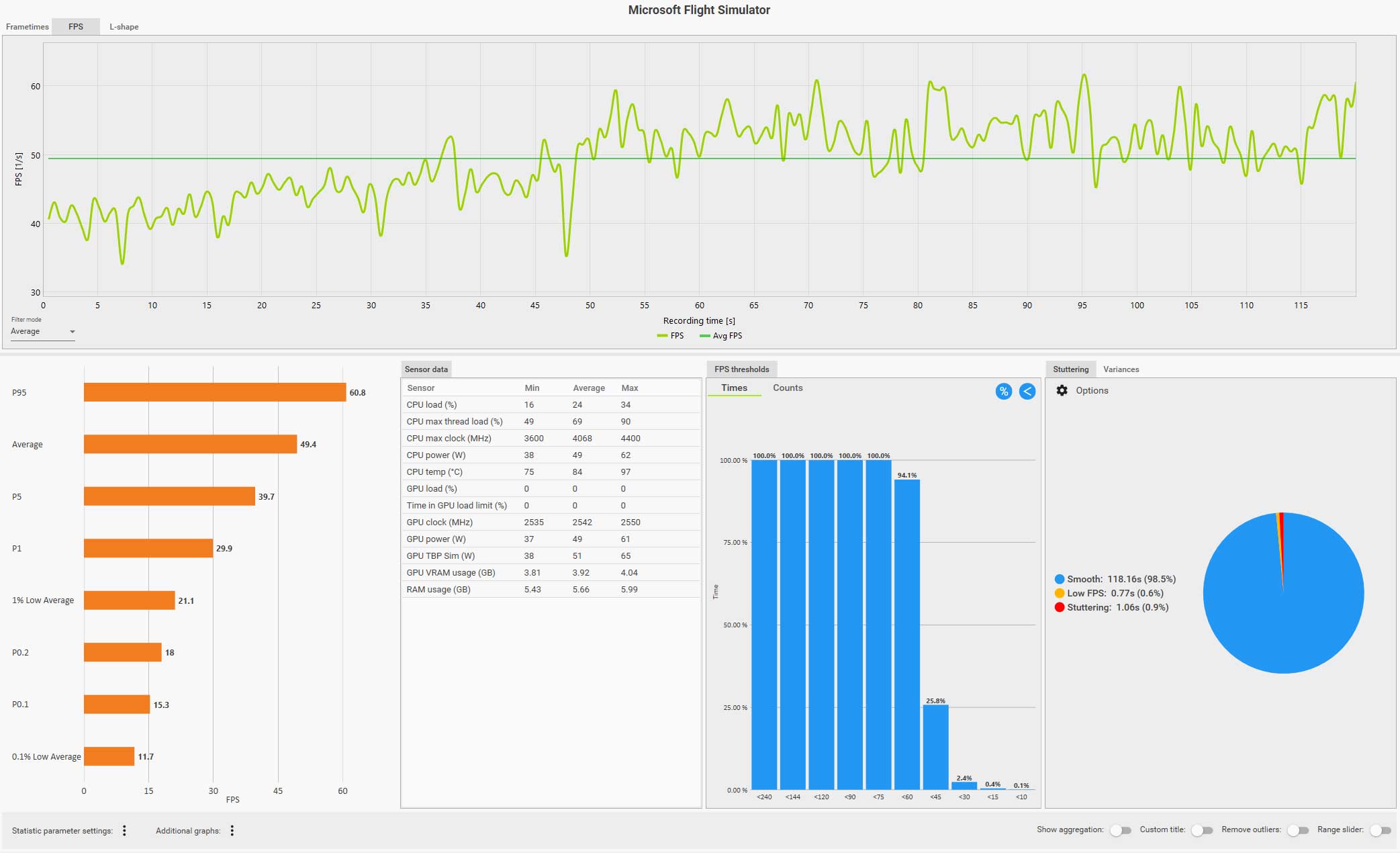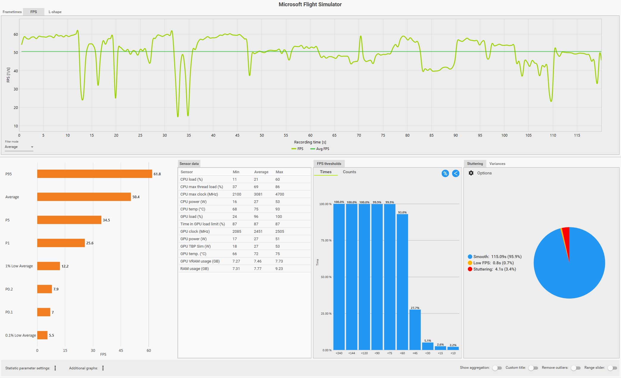 この条件(WQHD、画質ウルトラ、DLSS FG 有効、コクピット視点)で飛んでいても平均 61 fps は出ているのですが、0.1% LOW Avg. が 4.9 fps、また円グラフ見てもスタッタリングも発生しているのが判ります。