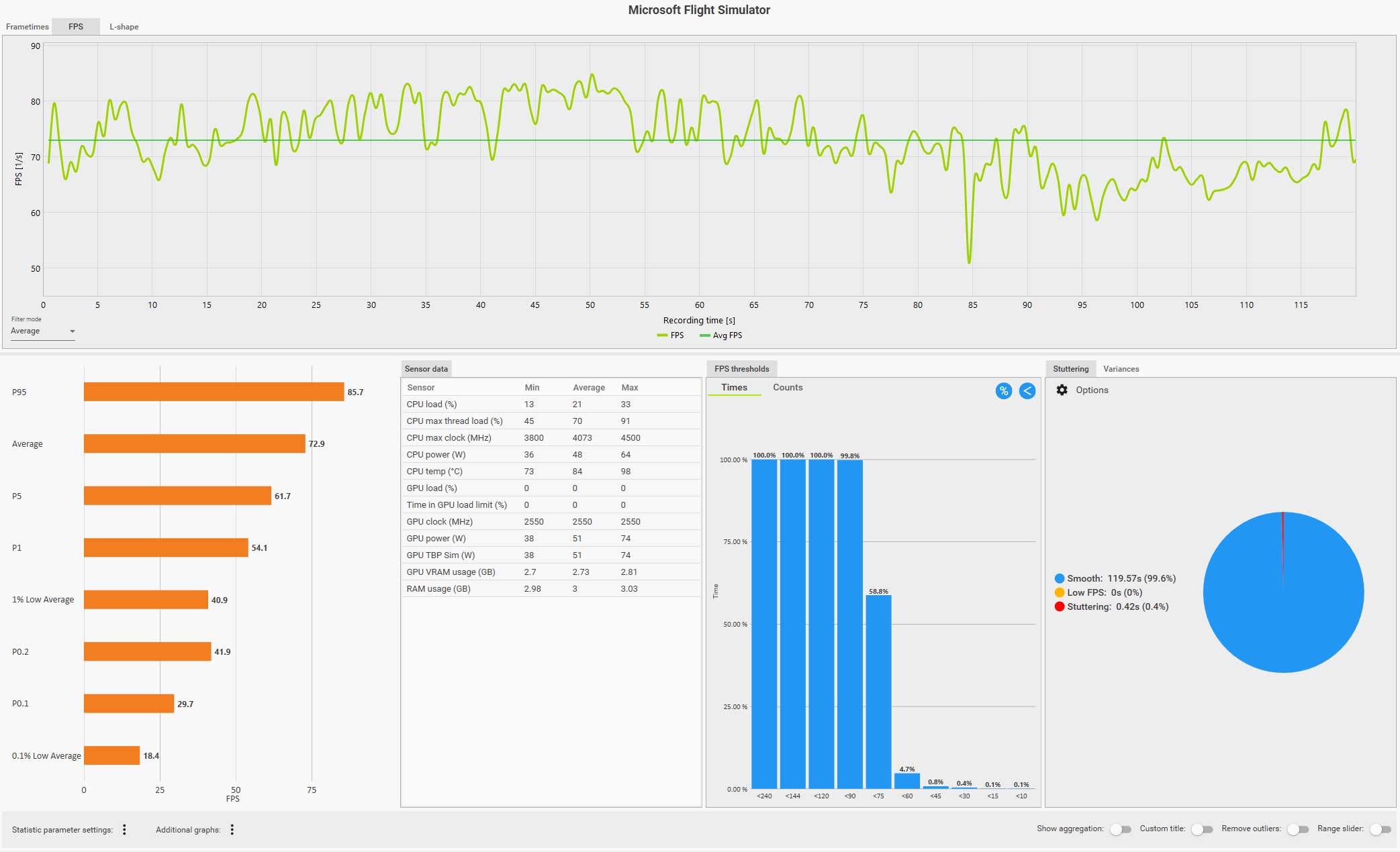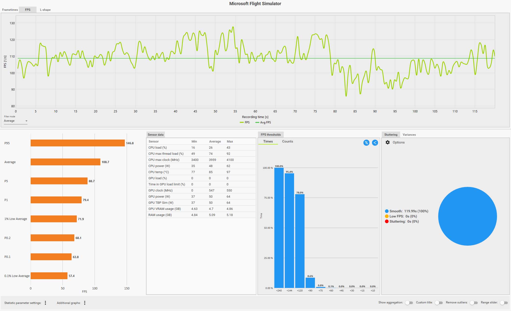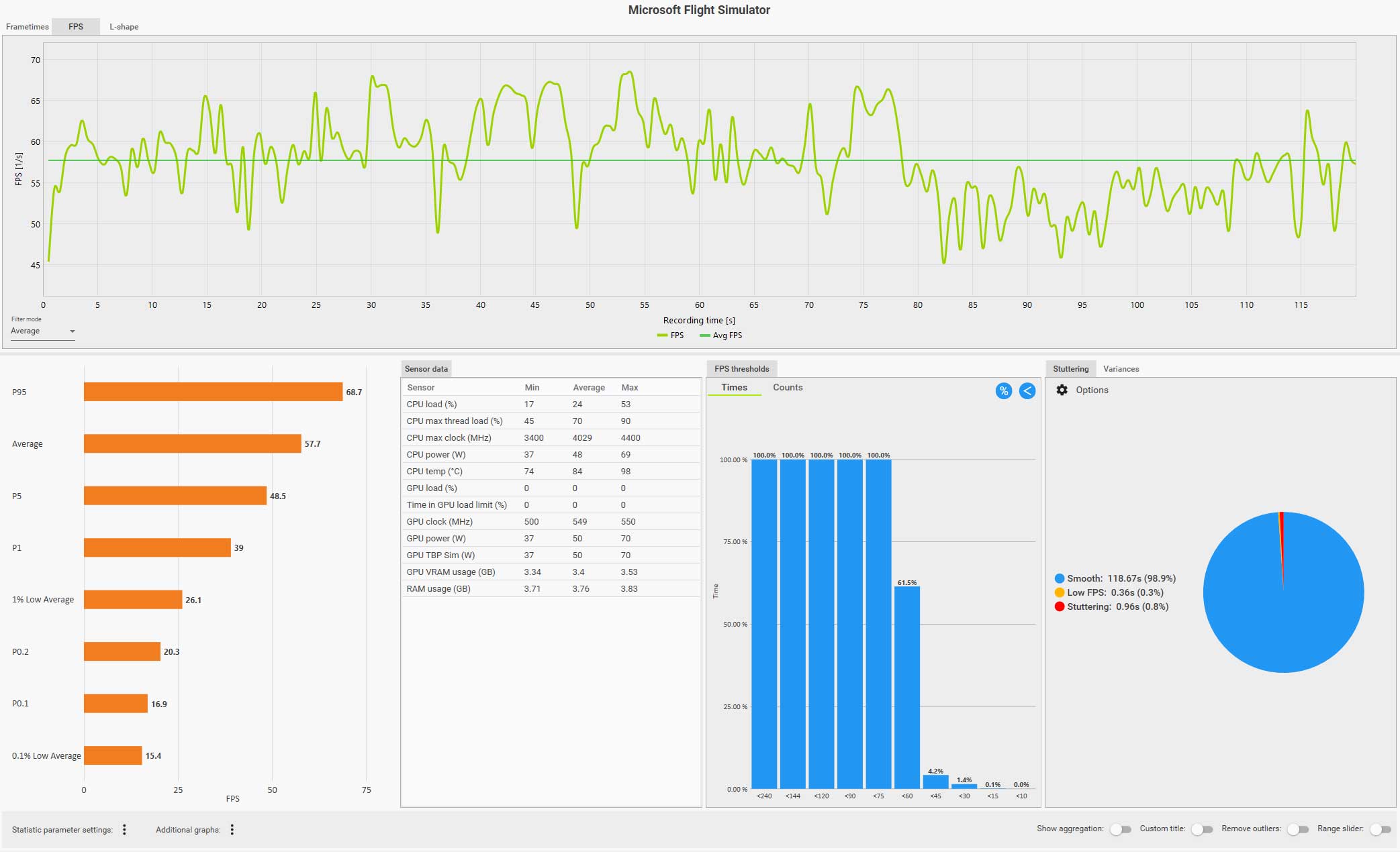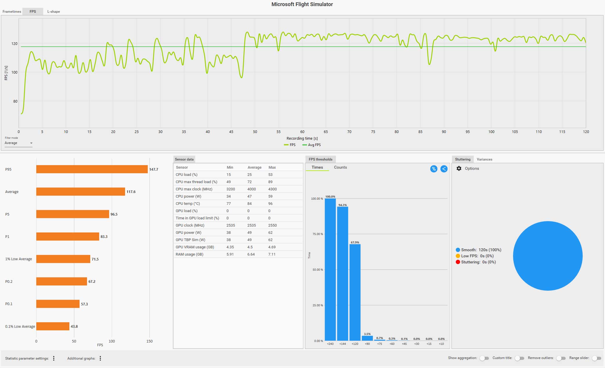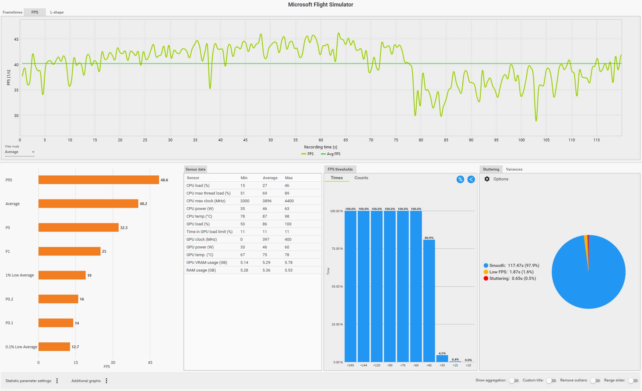 この条件(WQHD、画質ウルトラ、DLSS FG 有効、コクピット視点)で飛んでいても平均 61 fps は出ているのですが、0.1% LOW Avg. が 4.9 fps、また円グラフ見てもスタッタリングも発生しているのが判ります。