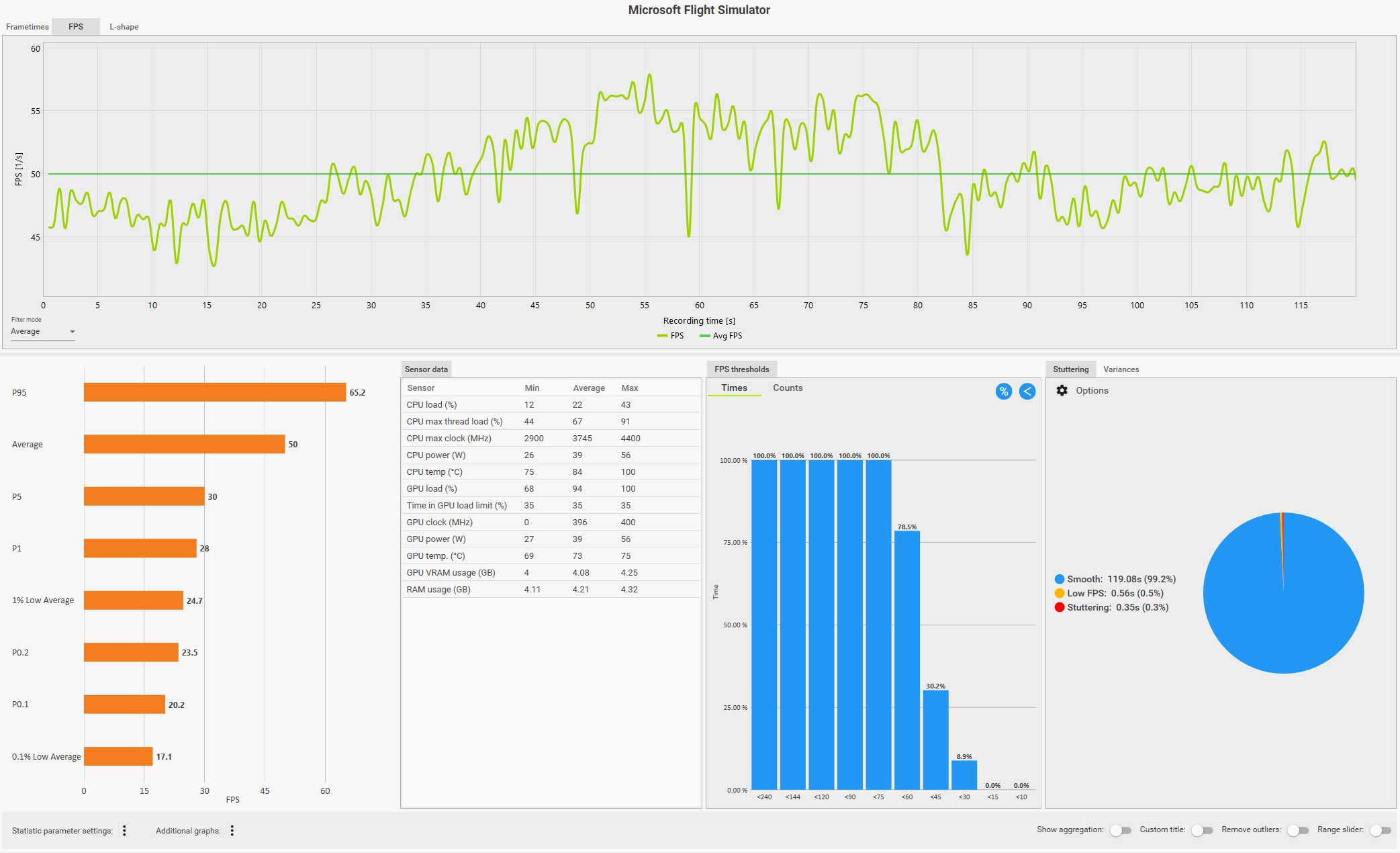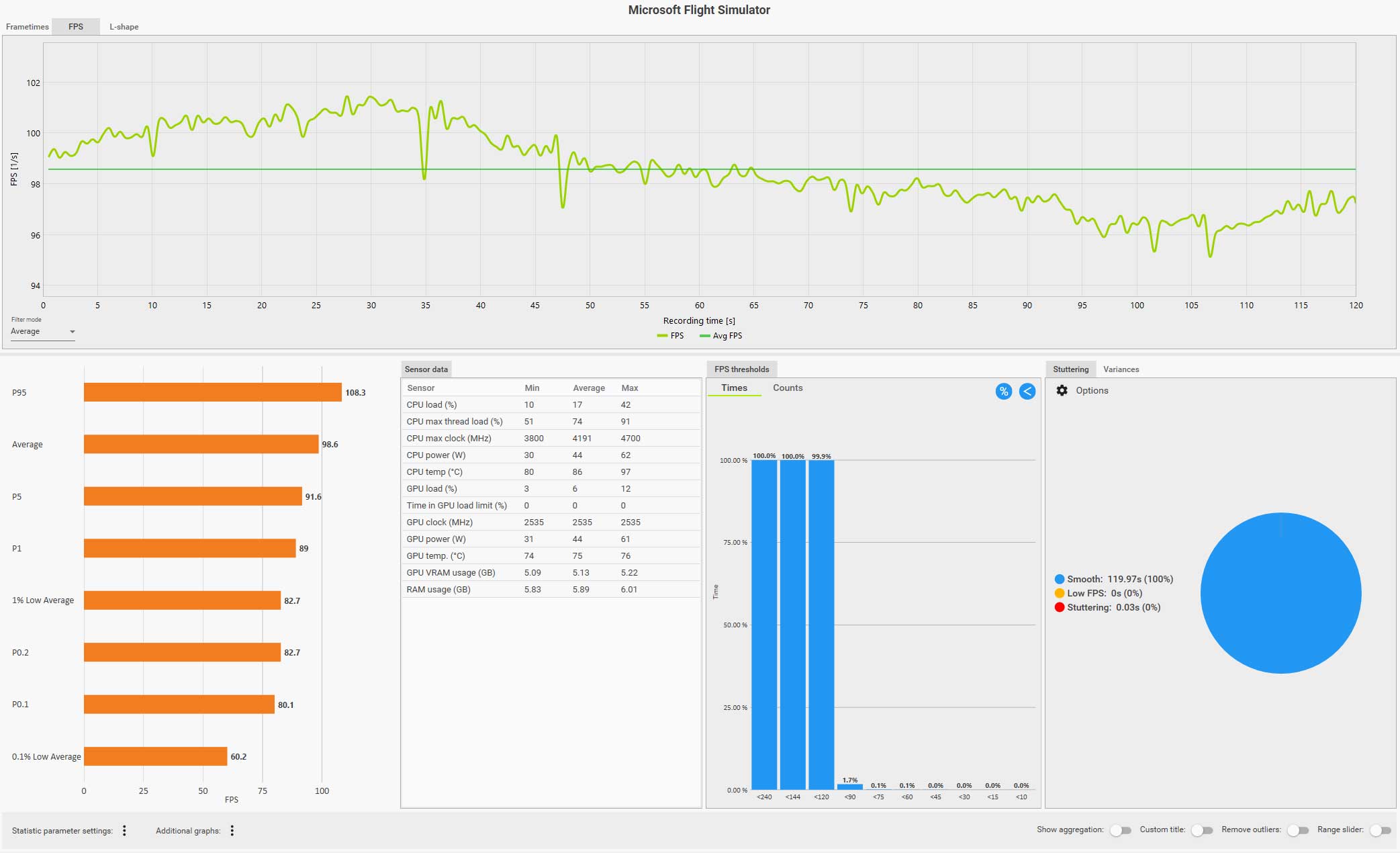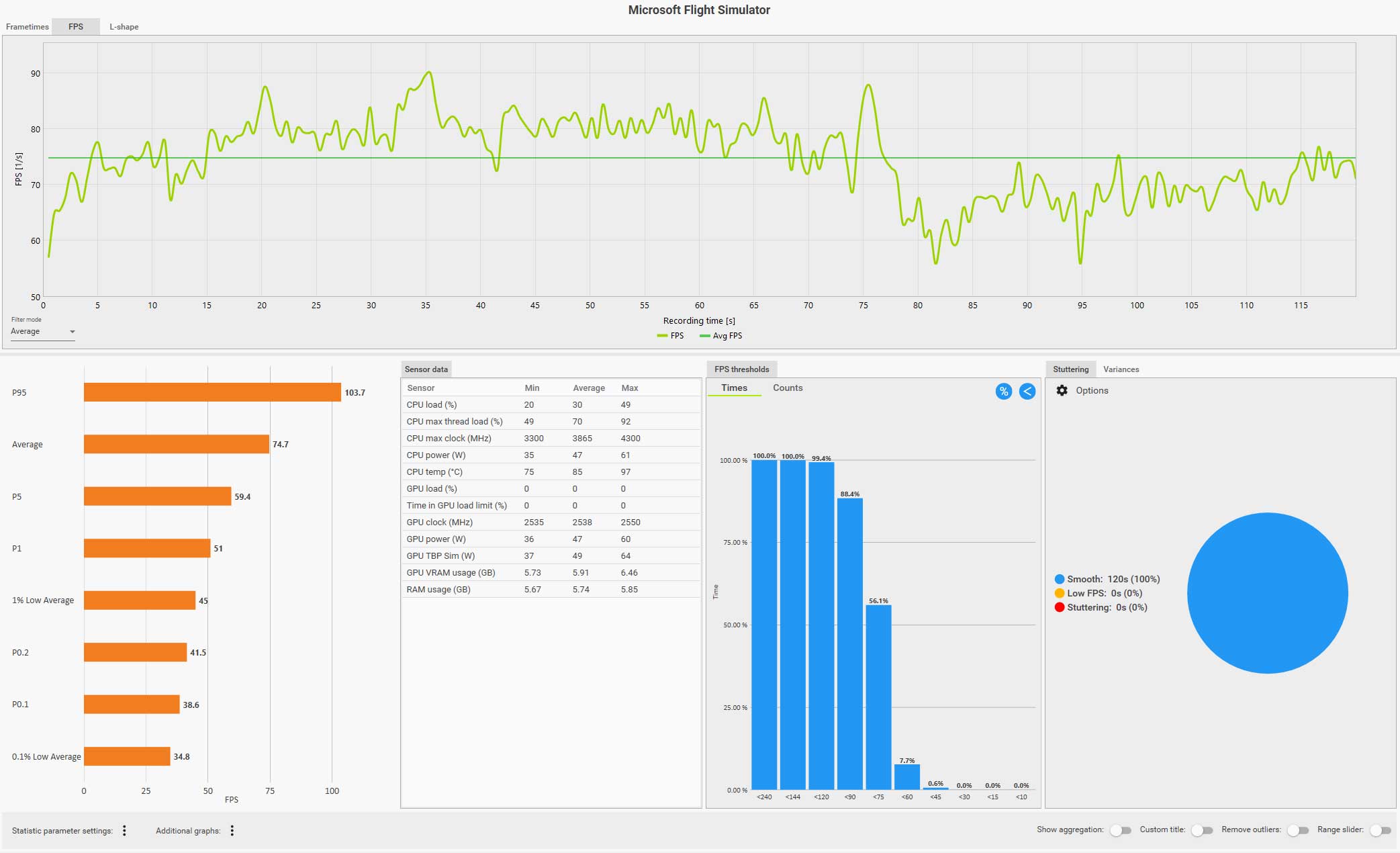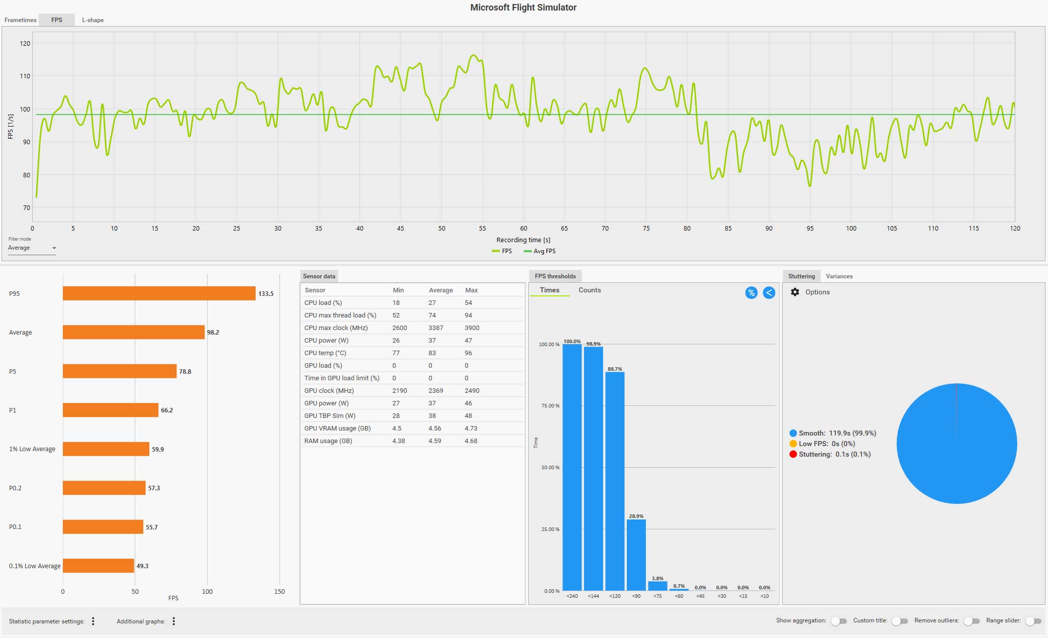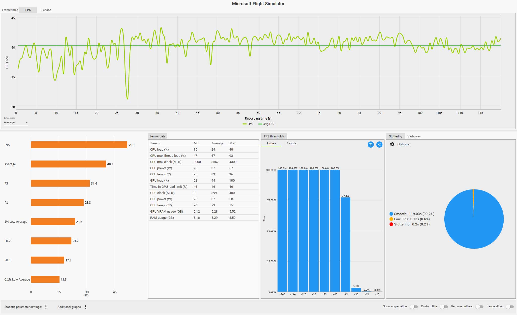 この条件(WQHD、画質ウルトラ、DLSS FG 有効、コクピット視点)で飛んでいても平均 61 fps は出ているのですが、0.1% LOW Avg. が 4.9 fps、また円グラフ見てもスタッタリングも発生しているのが判ります。