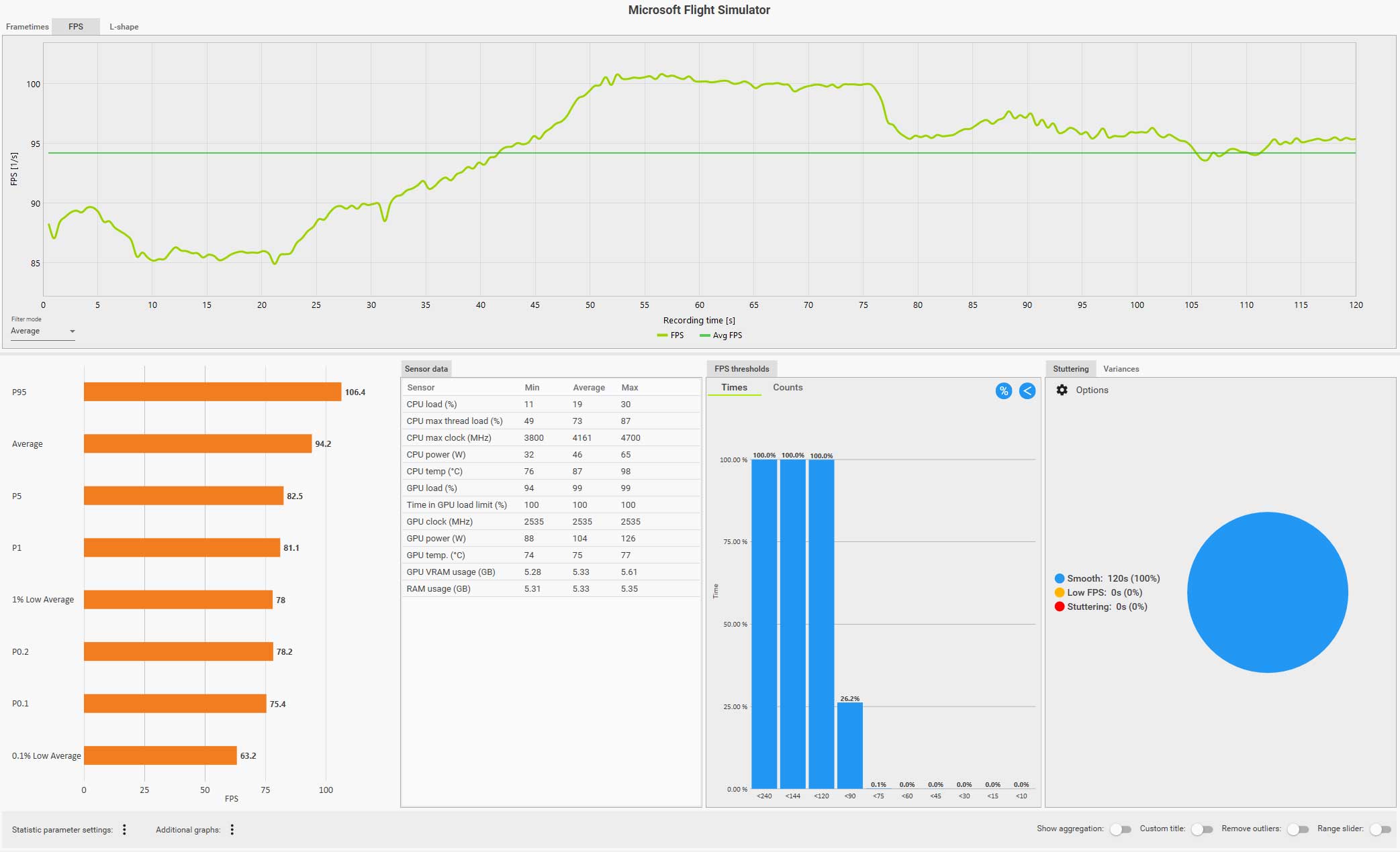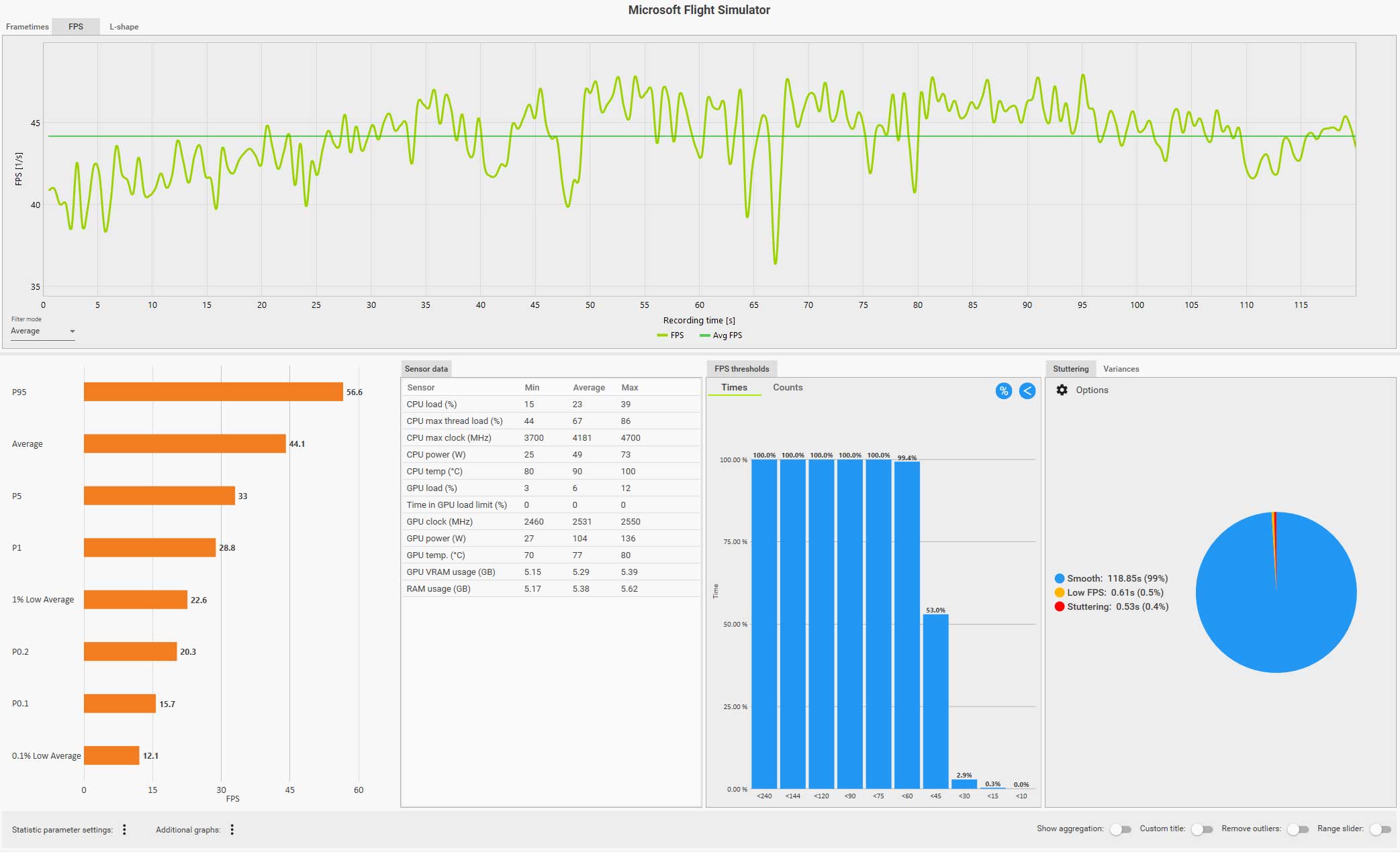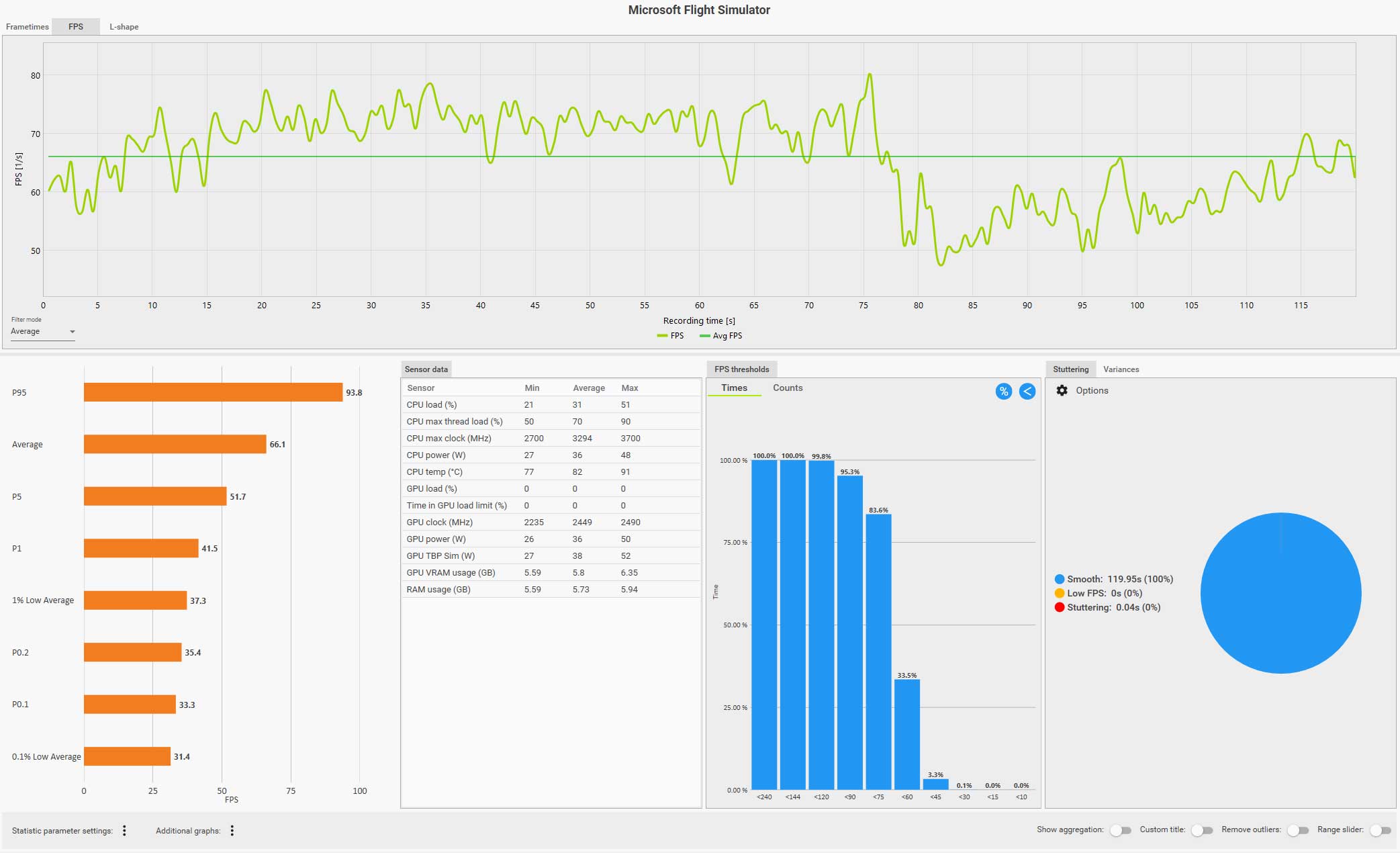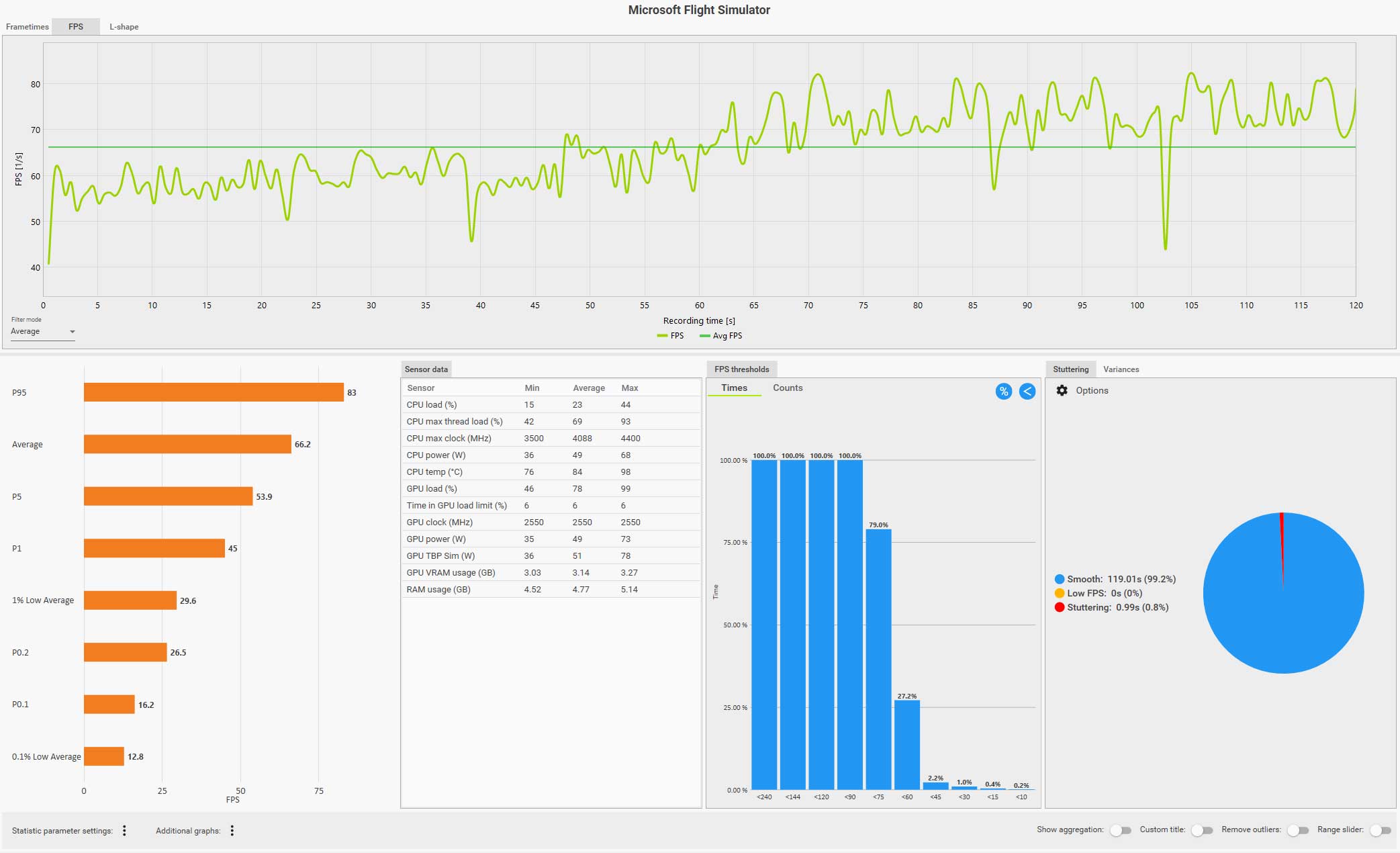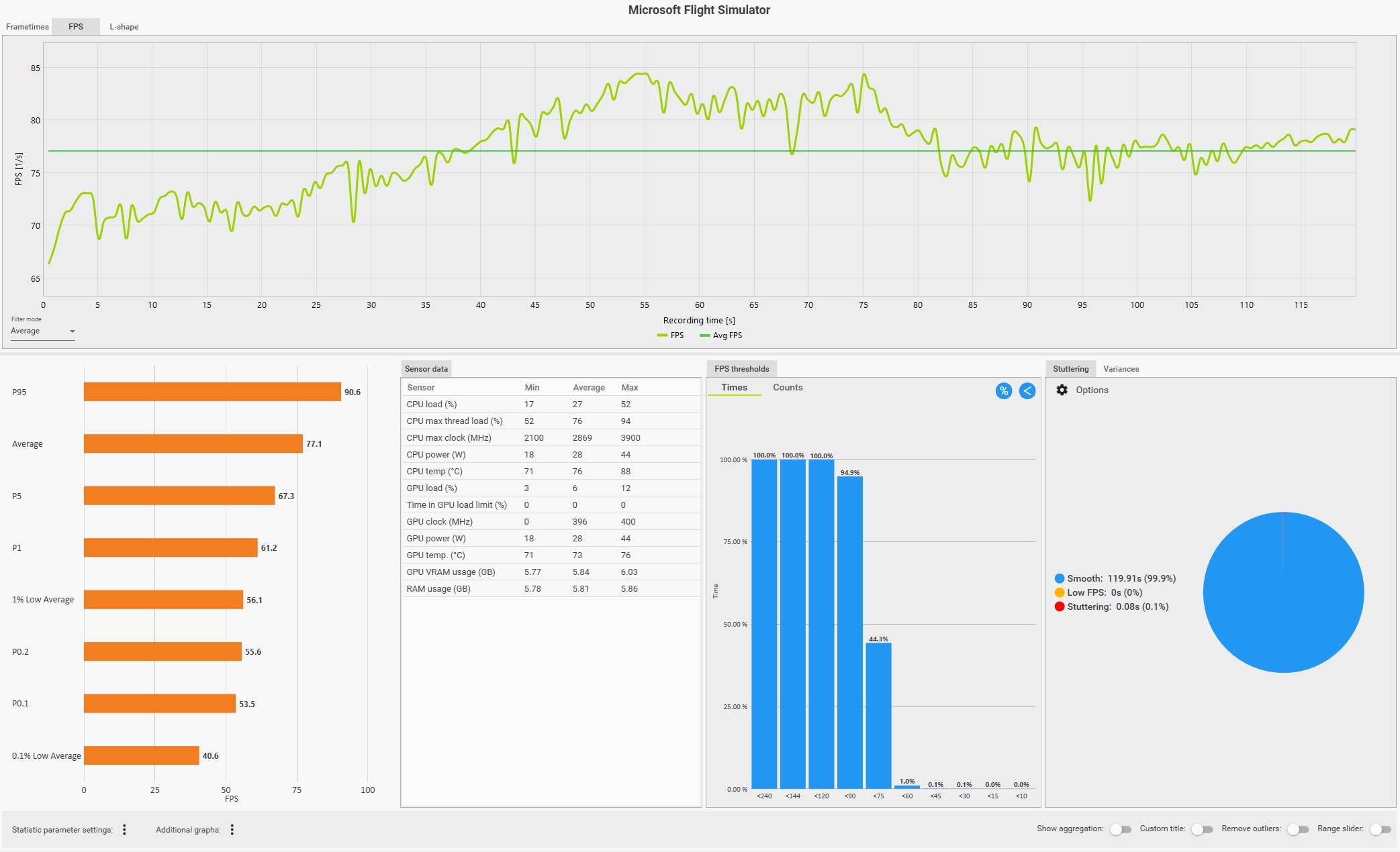 この条件(WQHD、画質ウルトラ、DLSS FG 有効、コクピット視点)で飛んでいても平均 61 fps は出ているのですが、0.1% LOW Avg. が 4.9 fps、また円グラフ見てもスタッタリングも発生しているのが判ります。