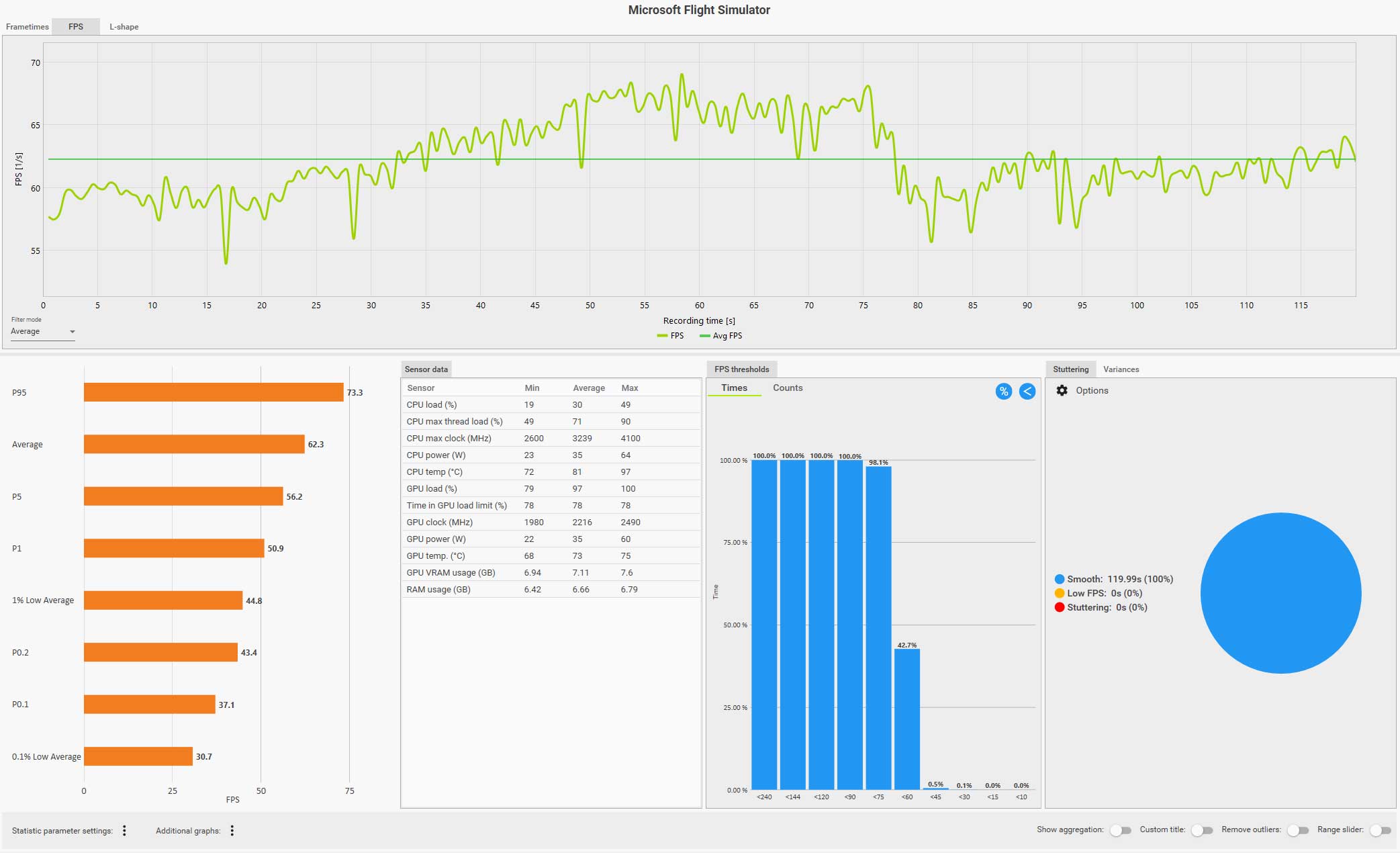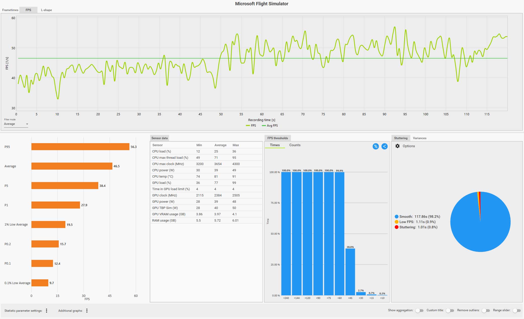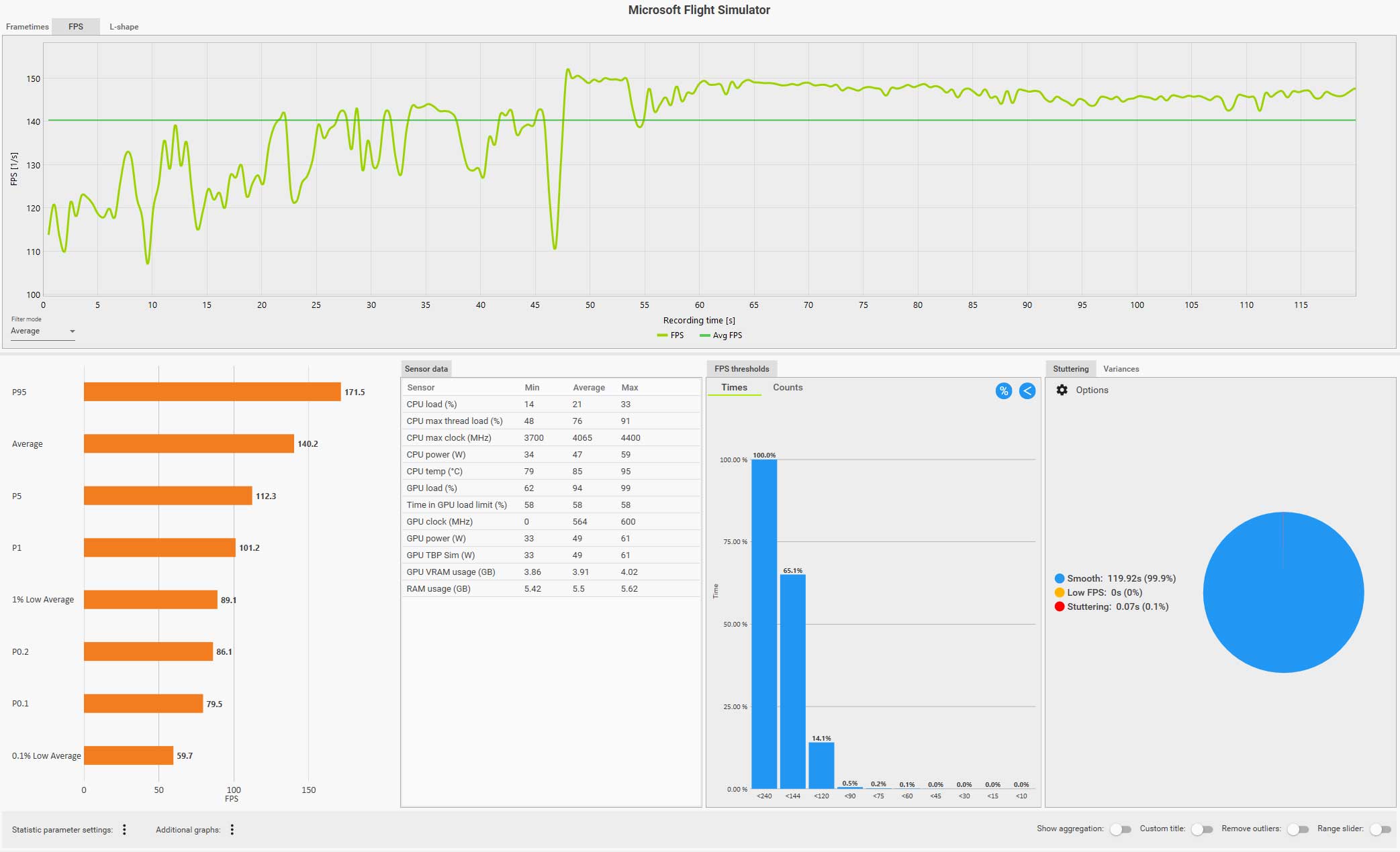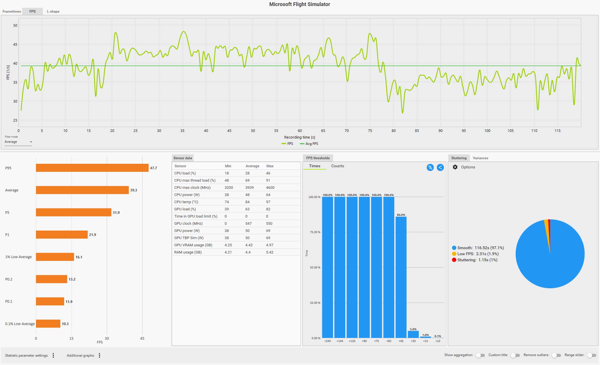 例えば、以下の CapFrameX のログ画面(クリックで拡大)は、ディスカバリーフライト:ニューヨークをコクピット視点で自らフライトしているものですが、フグラフを見ても分かるように、セントラルパークを抜けるあたりで右側の窓を見るなどした場合にガクッと大きくフレームレートが落ち込んでいます。
