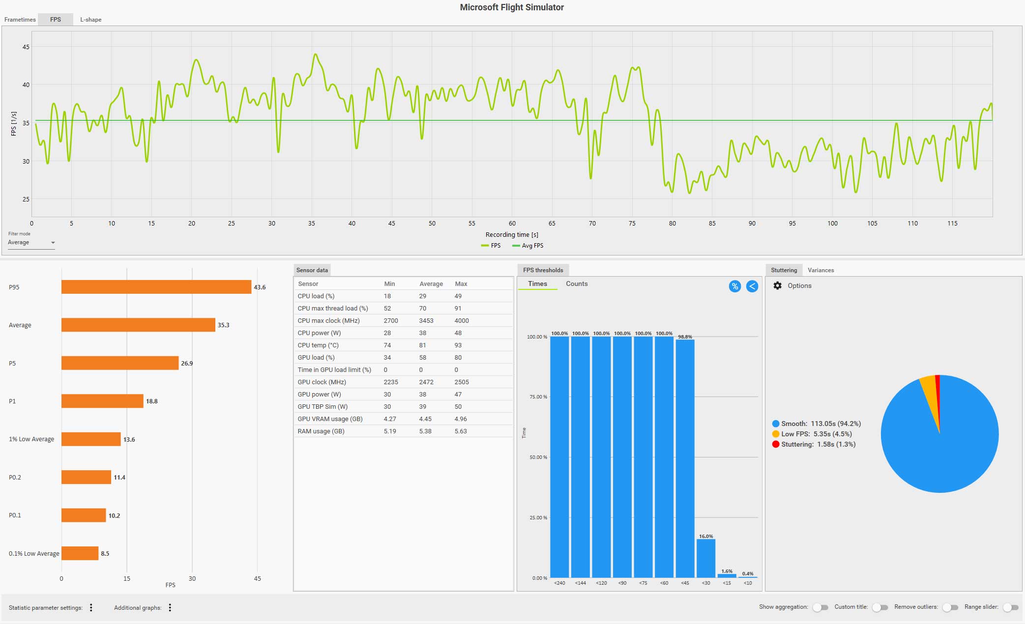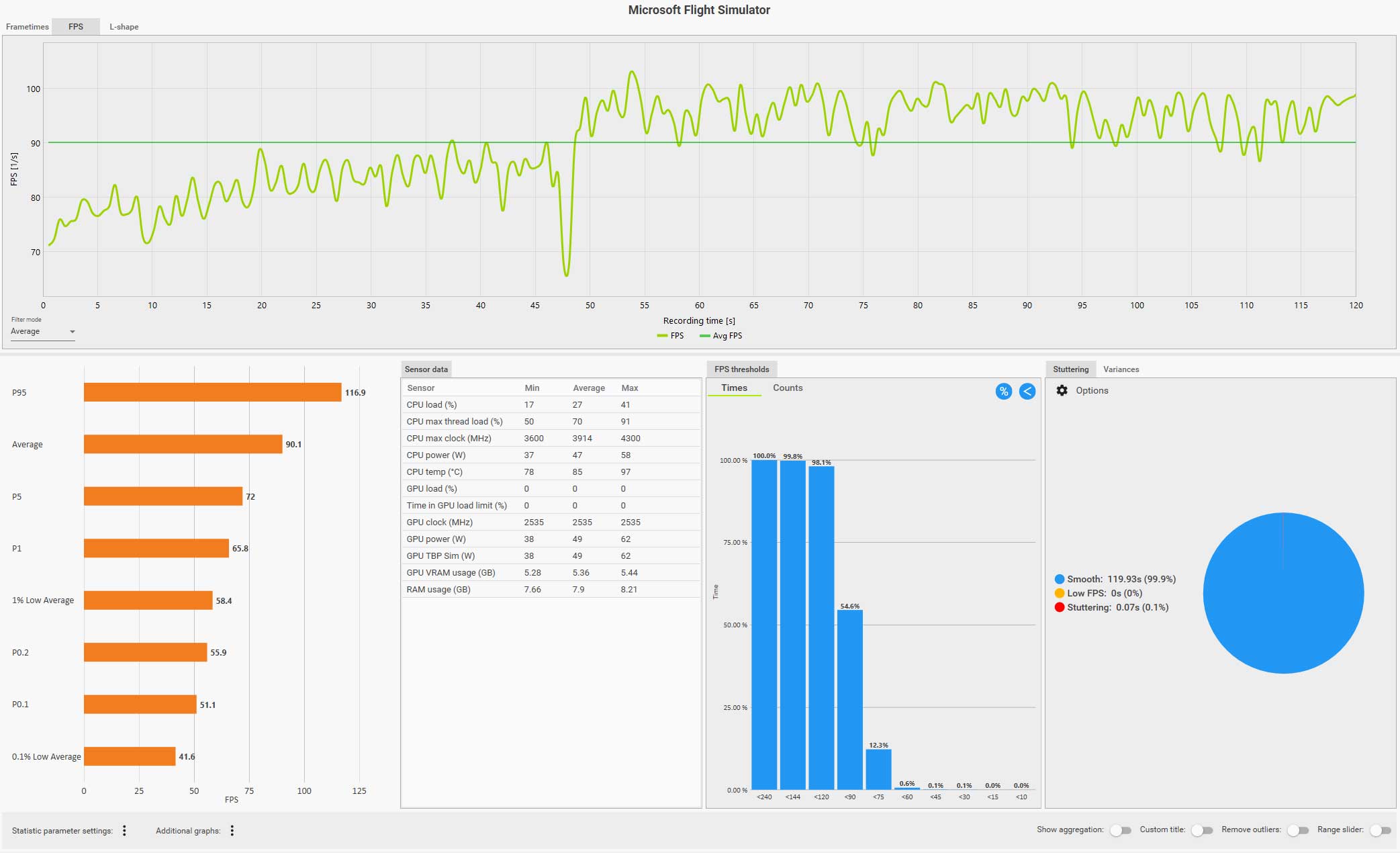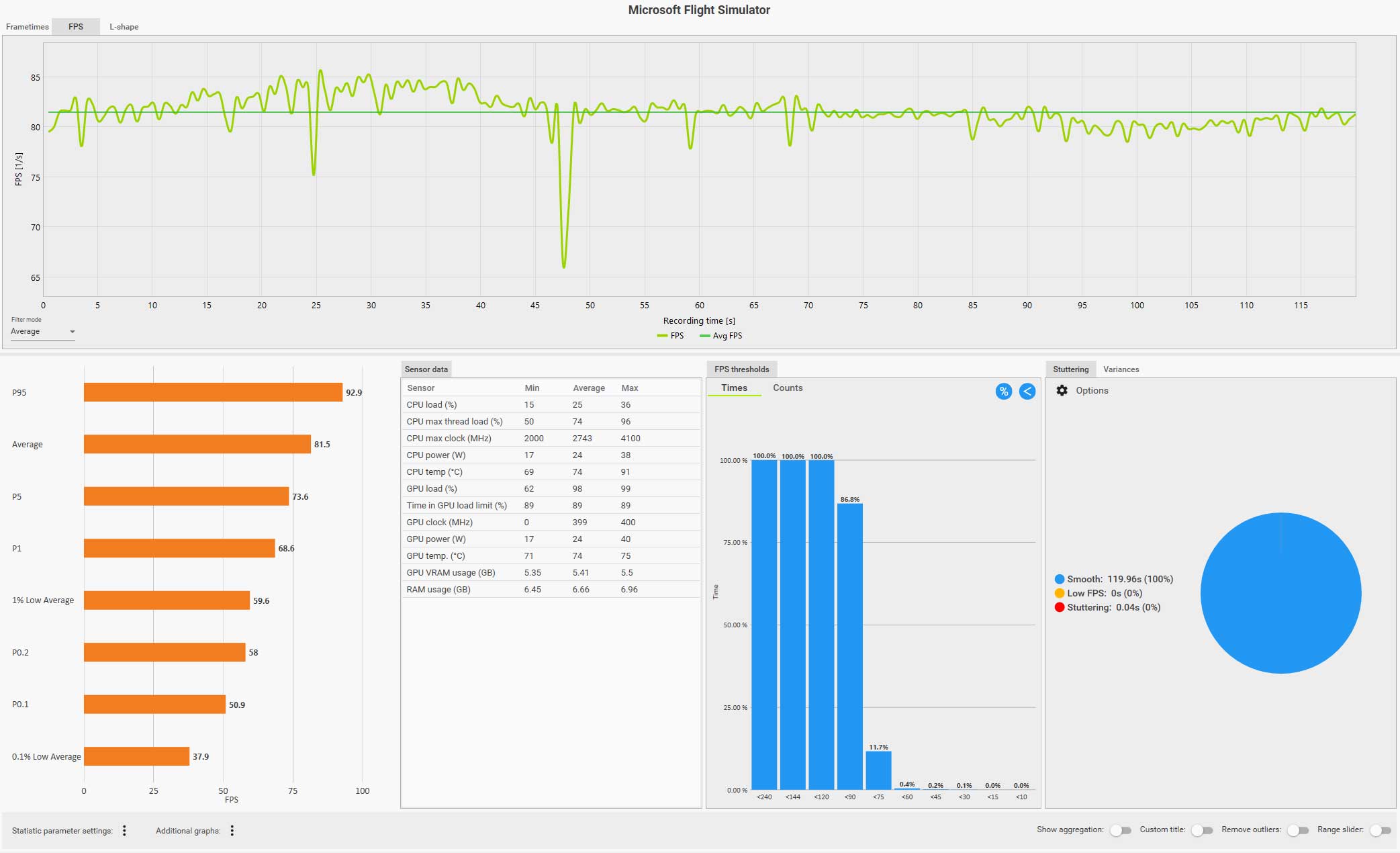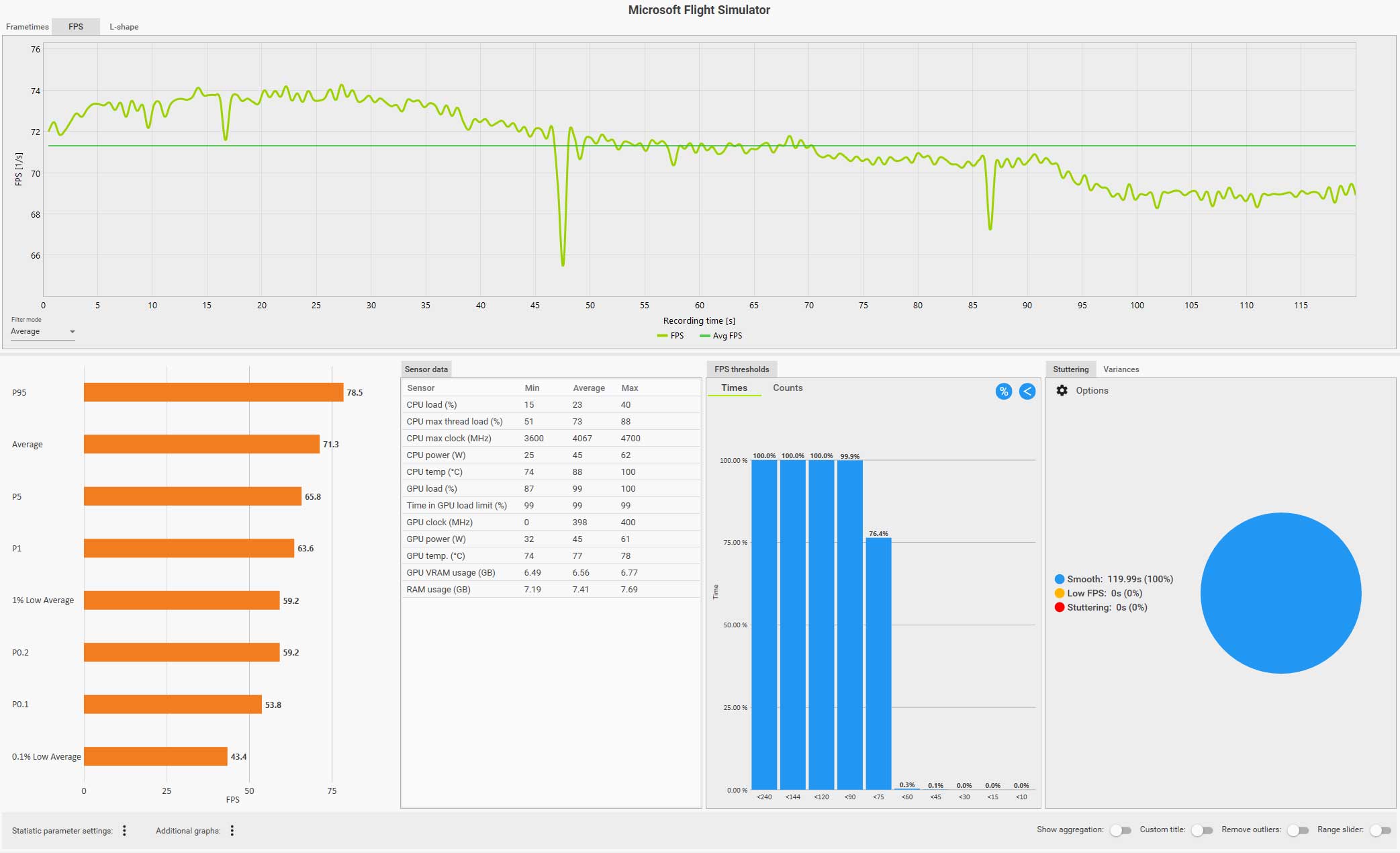 例えば、以下の CapFrameX のログ画面(クリックで拡大)は、ディスカバリーフライト:ニューヨークをコクピット視点で自らフライトしているものですが、フグラフを見ても分かるように、セントラルパークを抜けるあたりで右側の窓を見るなどした場合にガクッと大きくフレームレートが落ち込んでいます。