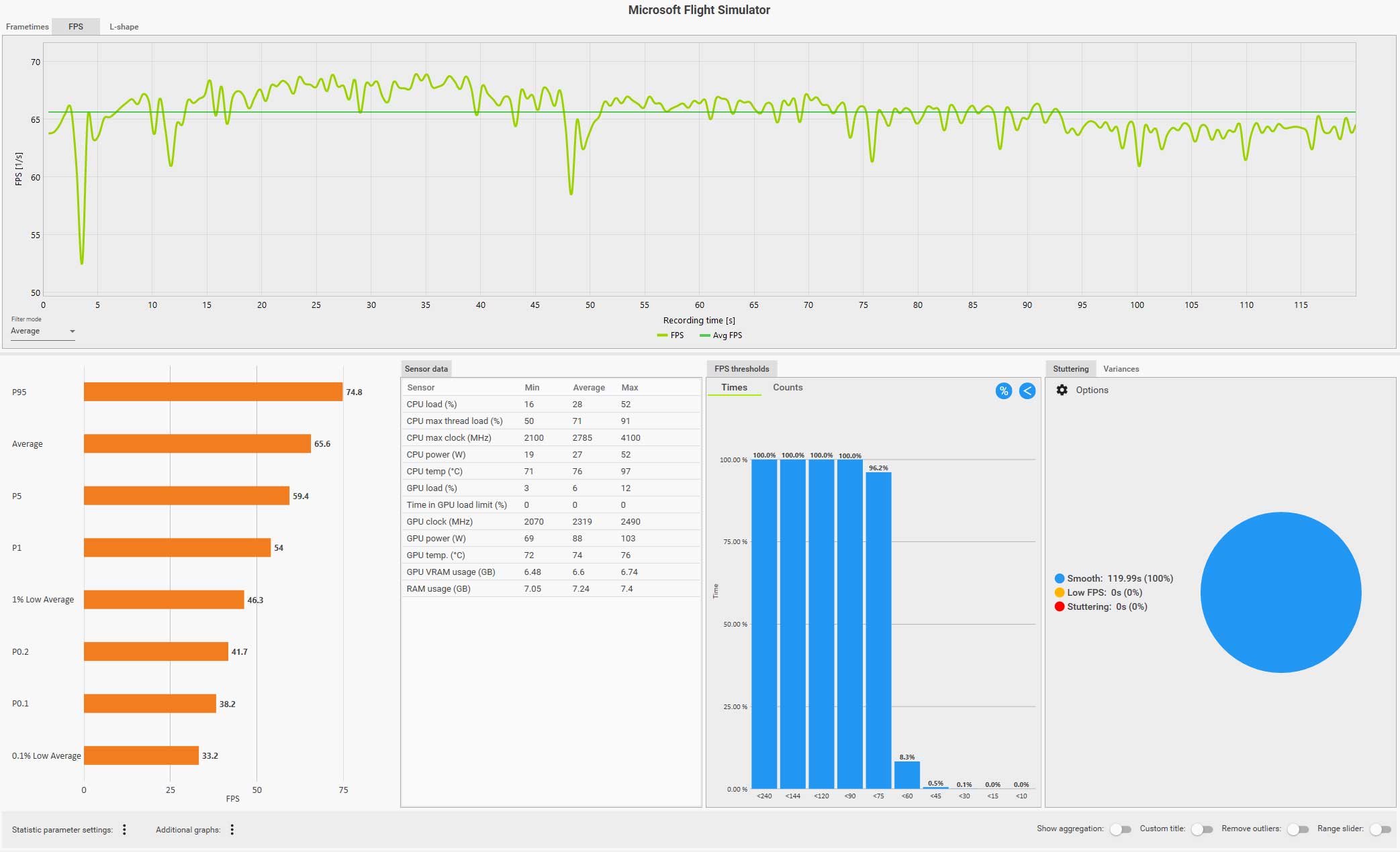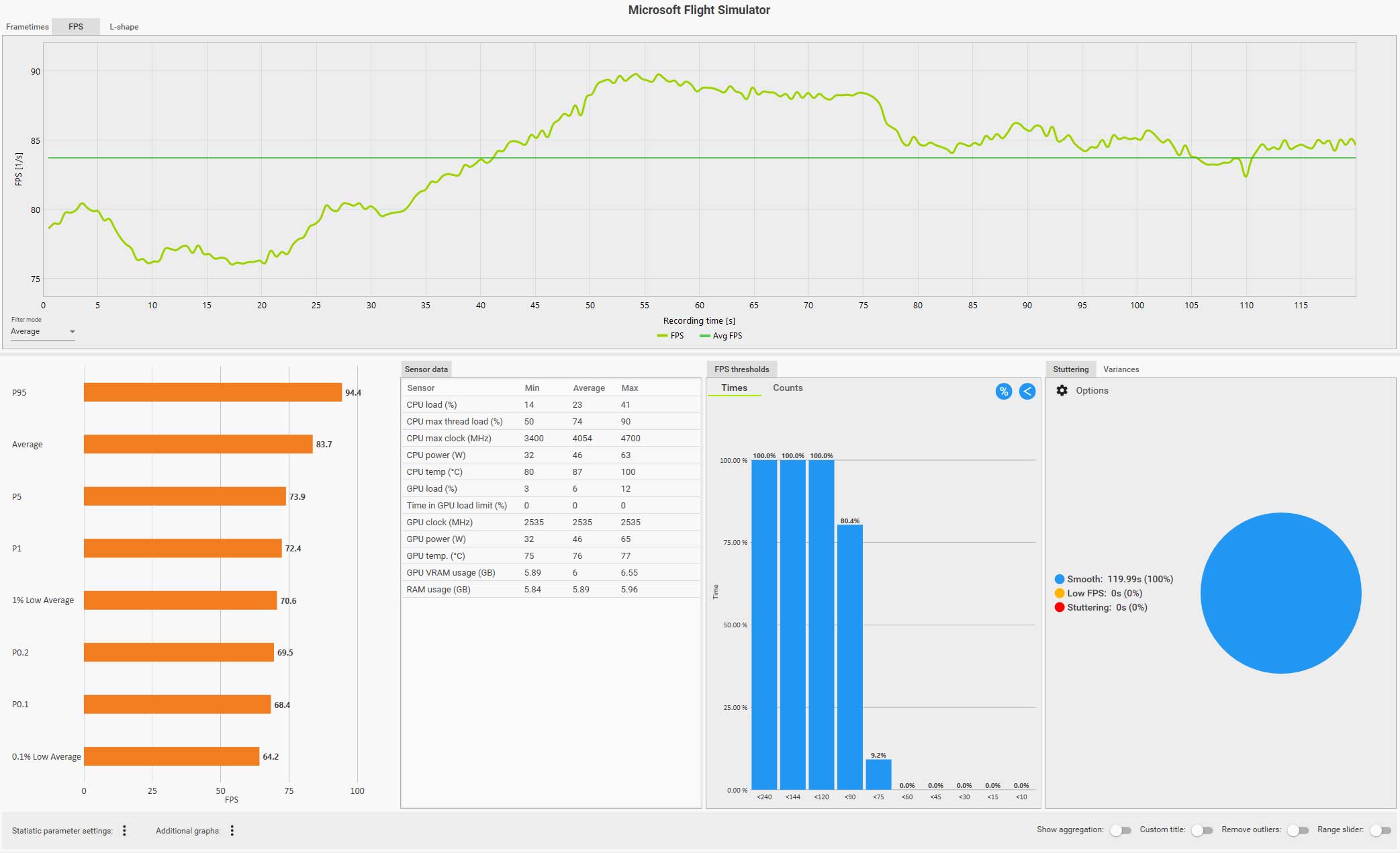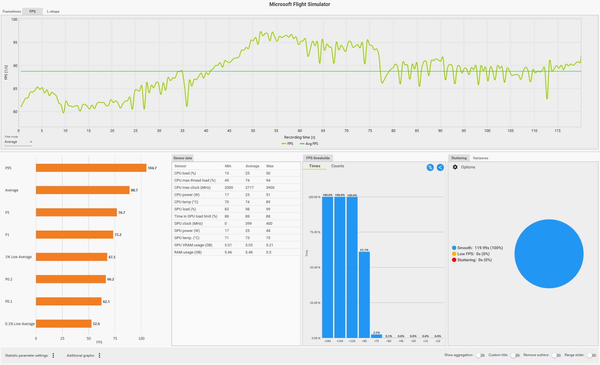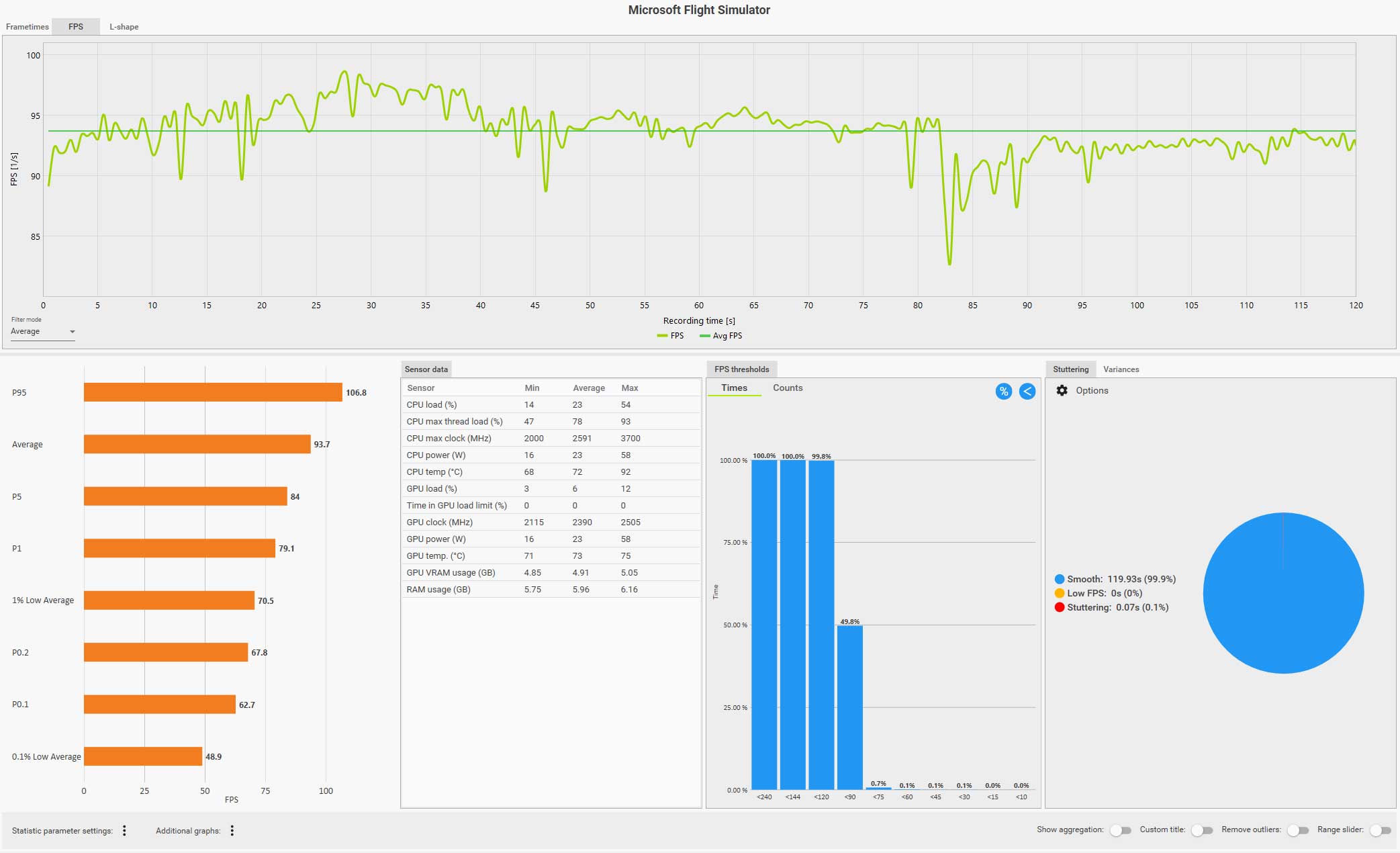 例えば、以下の CapFrameX のログ画面(クリックで拡大)は、ディスカバリーフライト:ニューヨークをコクピット視点で自らフライトしているものですが、フグラフを見ても分かるように、セントラルパークを抜けるあたりで右側の窓を見るなどした場合にガクッと大きくフレームレートが落ち込んでいます。