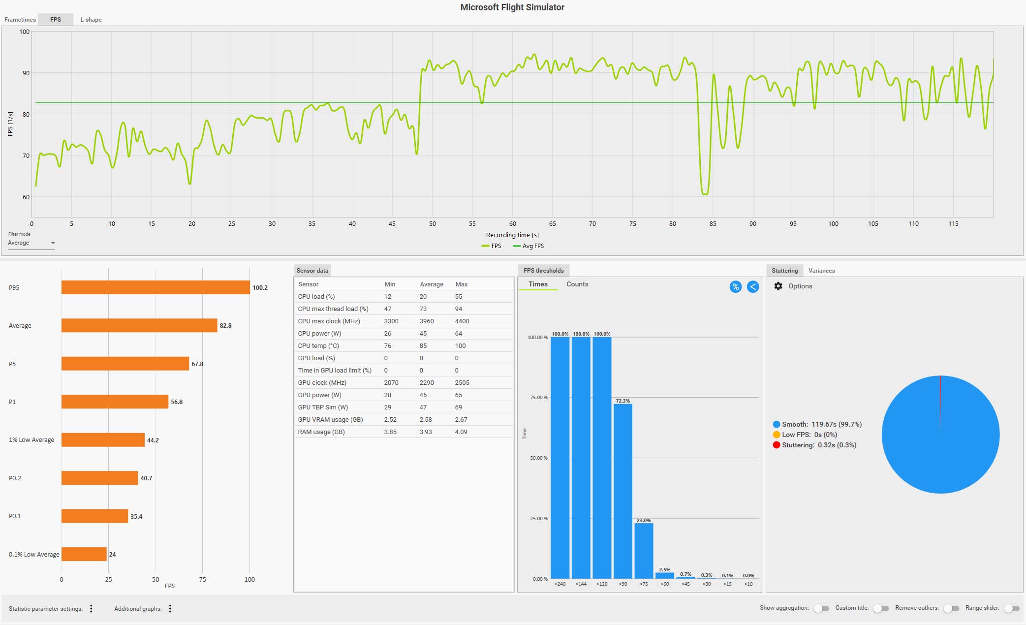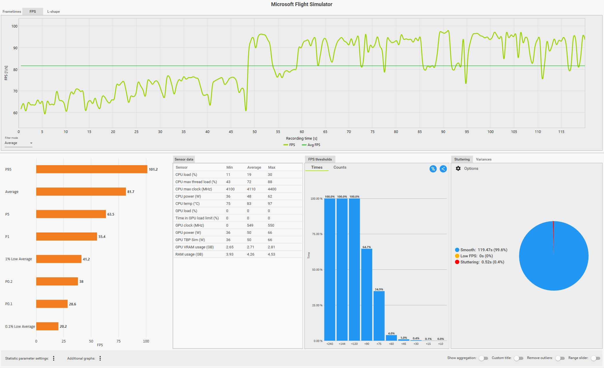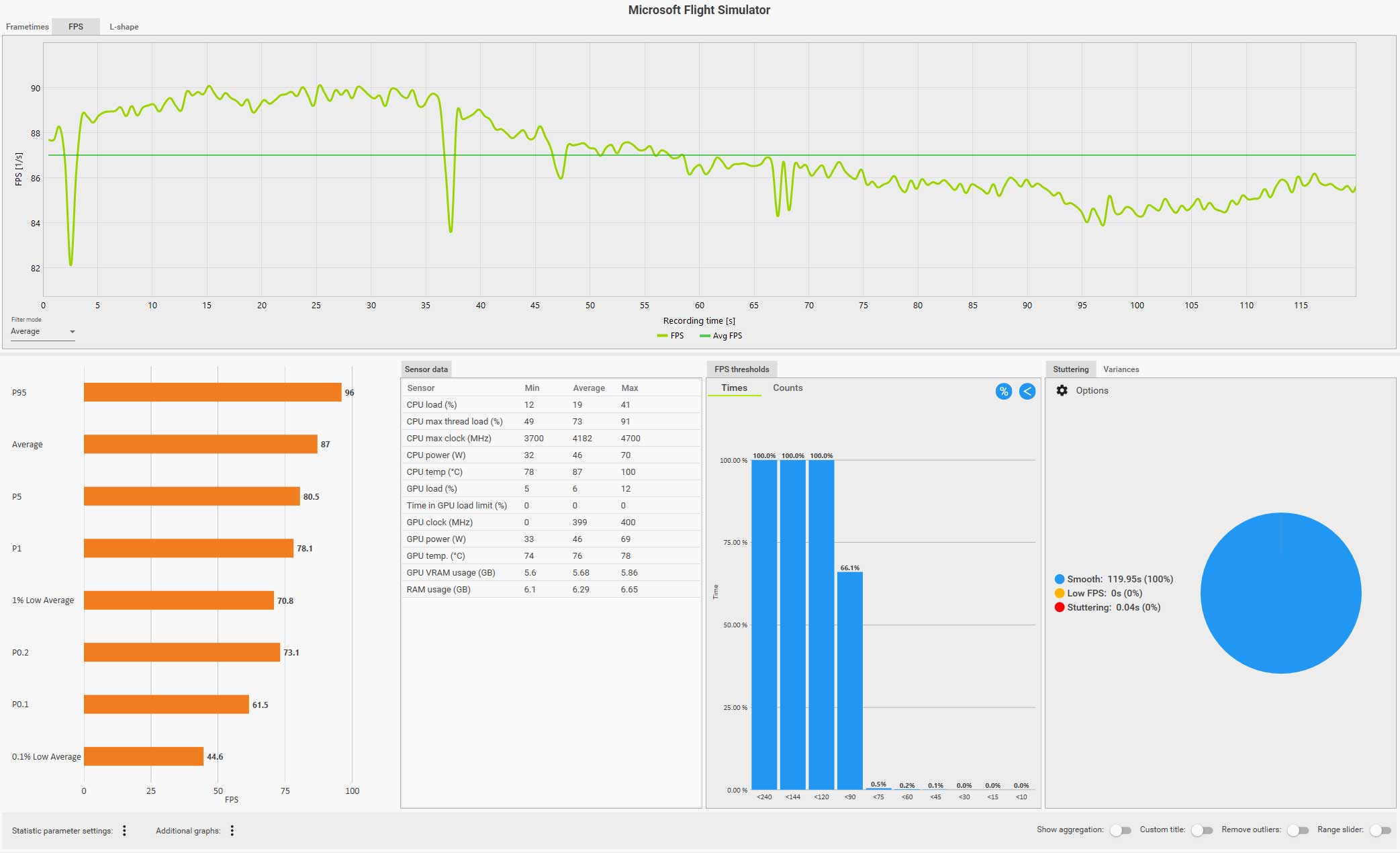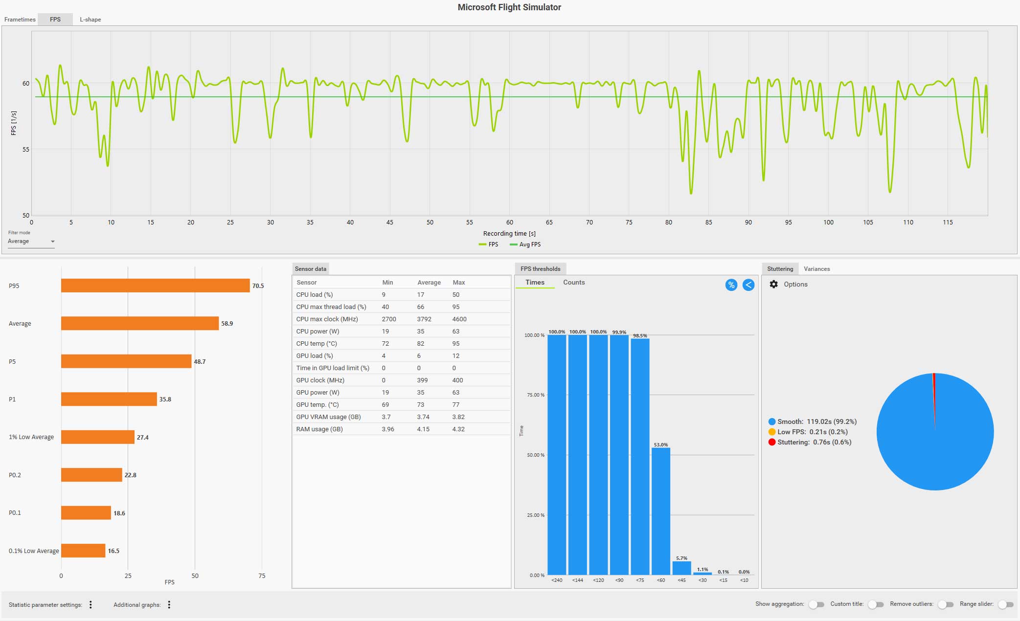 例えば、以下の CapFrameX のログ画面(クリックで拡大)は、ディスカバリーフライト:ニューヨークをコクピット視点で自らフライトしているものですが、フグラフを見ても分かるように、セントラルパークを抜けるあたりで右側の窓を見るなどした場合にガクッと大きくフレームレートが落ち込んでいます。