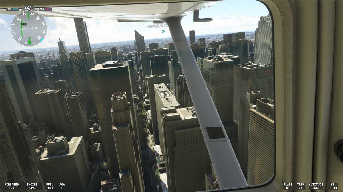 ましてや、低空で摩天楼のビル群を縫って飛ぶようなアクロバティックな(ゲームでしかできない)フライトで遊んでいると、視点変更しなくてもフレームレートが 30fps を大きく割り込んで入力遅延を感じることになります。