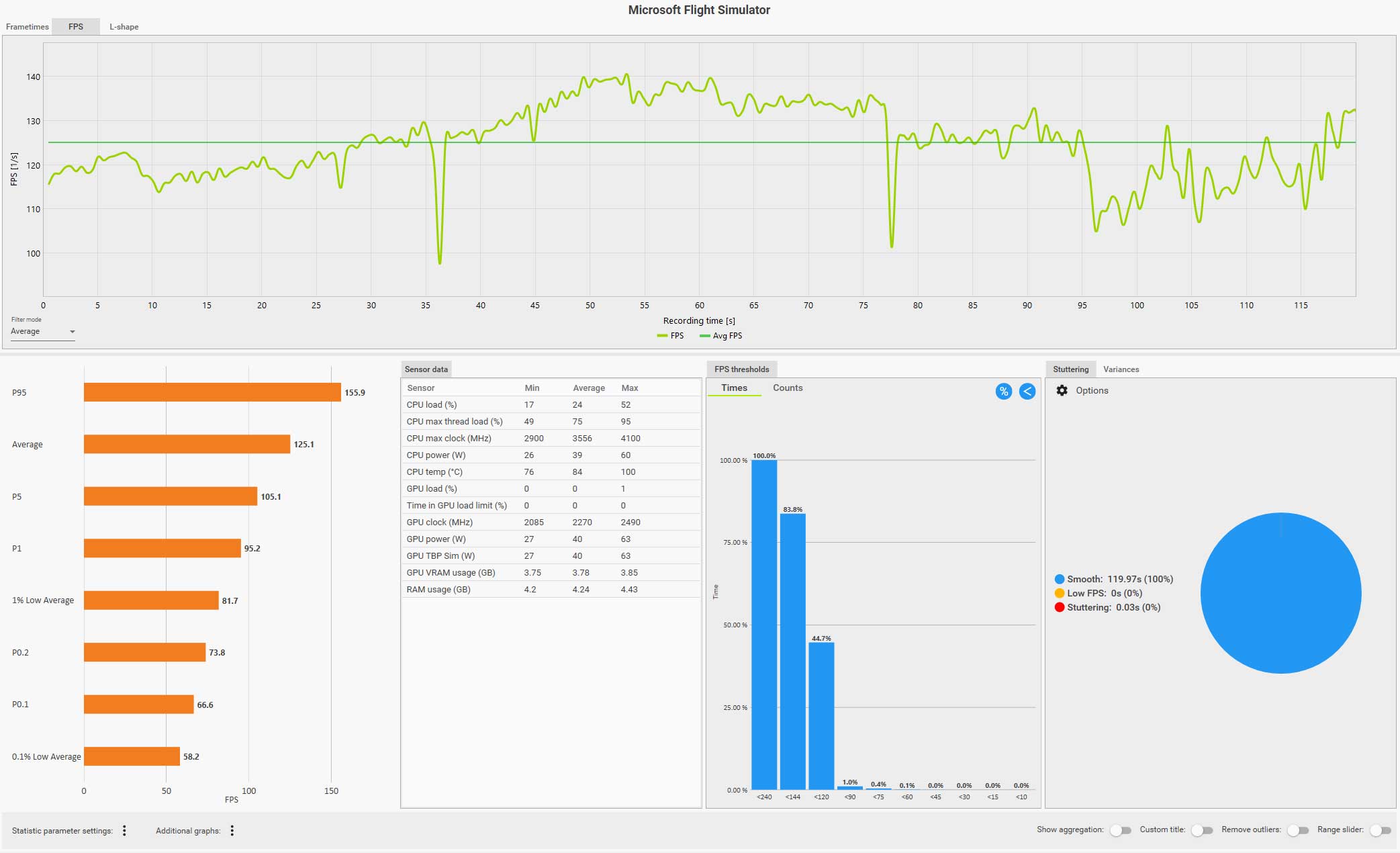 - フレームレート測定は、ディスカバリーフライトスタート時から AI で2分間真っ直ぐ飛行した場合のフレームレートを CapFrameX にて測定