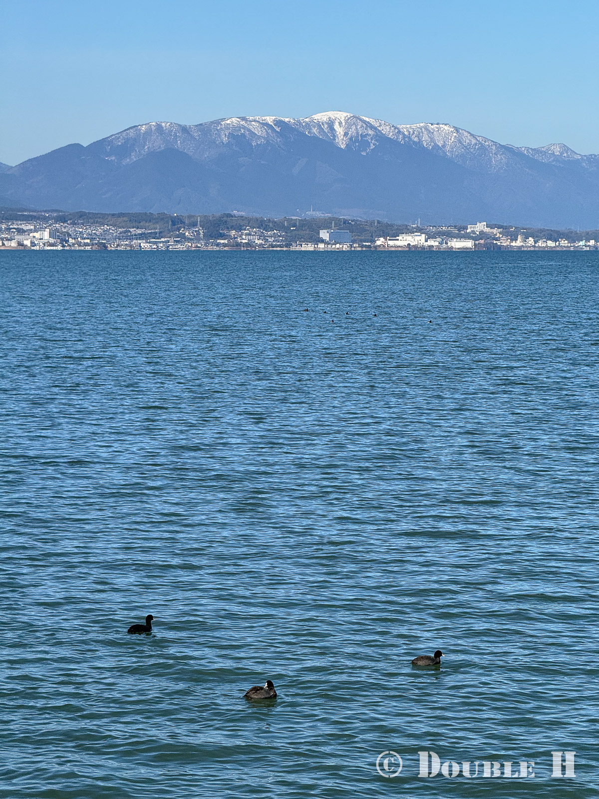 今年初めて湖岸に立ち寄ってみると、雪を抱いた比良山がクッキリ!