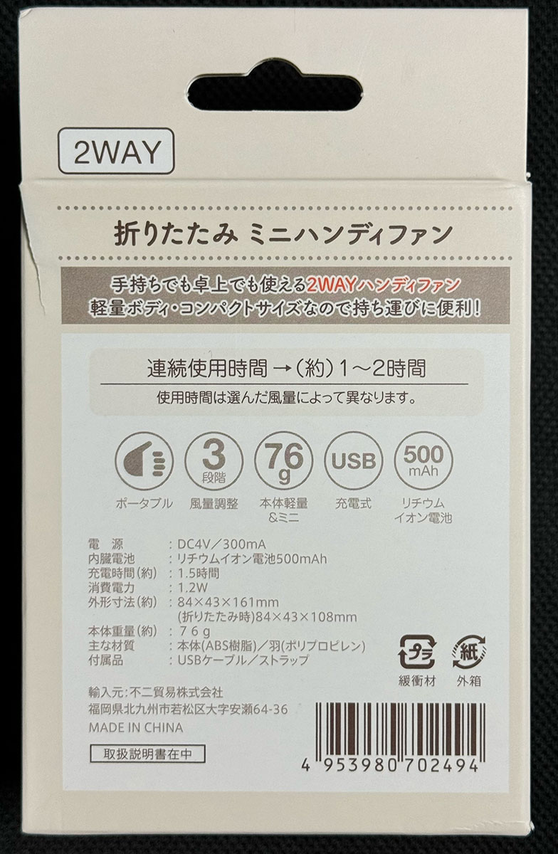 さて、今回紹介の Can★Do 折りたたみハンディファンですが、改めて言っておくと、ファンの風切り音がうるさい、という点を除けば悪くない印象です。