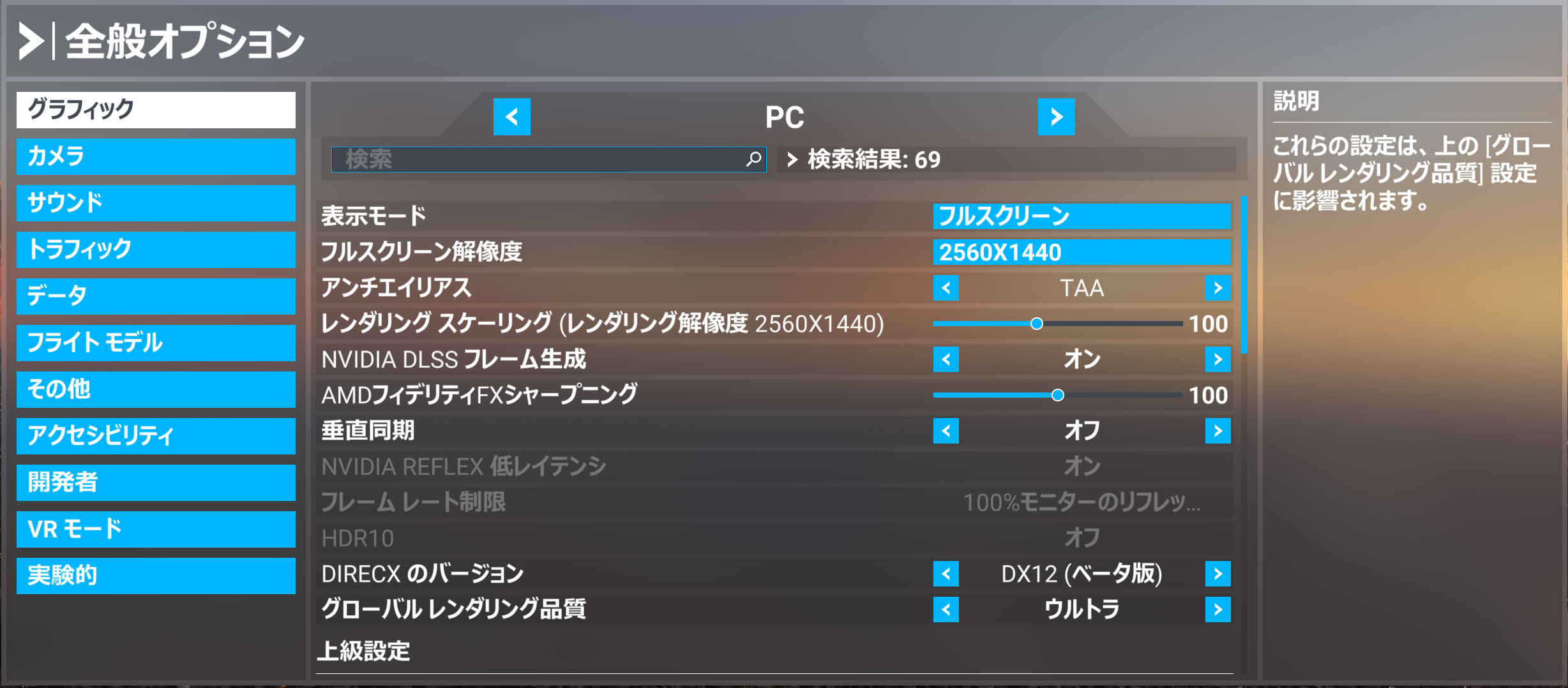現時点の私の環境だと、MSFS 2020 の通常プレイでは WQHD 解像度で画質プリセット ULTRA(最高)、アンチエイリアス TAA、レンダリング・スケーリング 100%、DLSS FG(フレームジェネレーション)有効、と、画質設定はほぼ最上級。