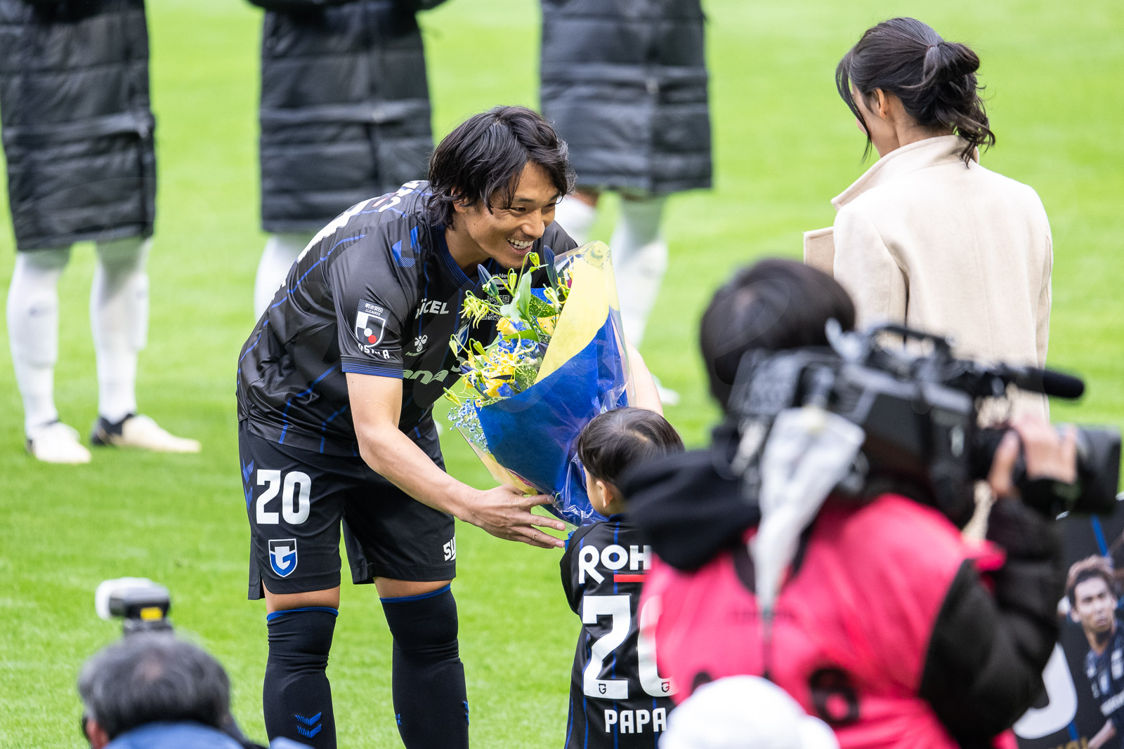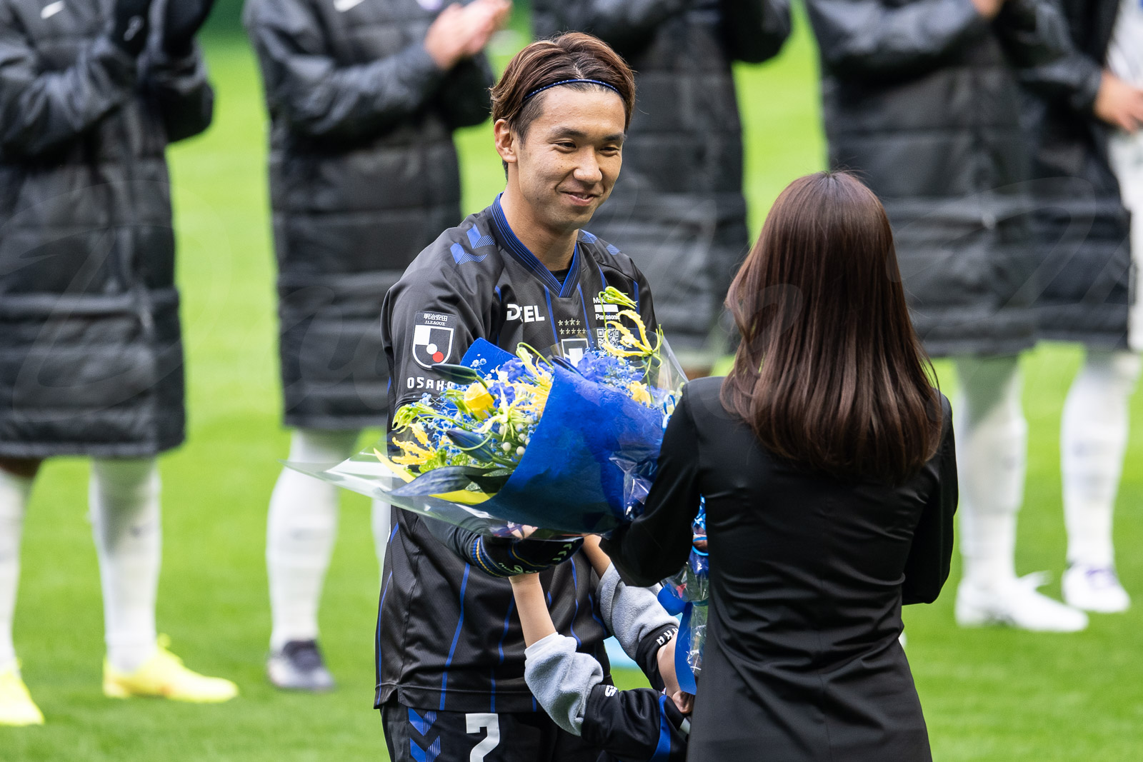 J1 300試合出場セレモニーの花束を受け取る中谷進之介選手。