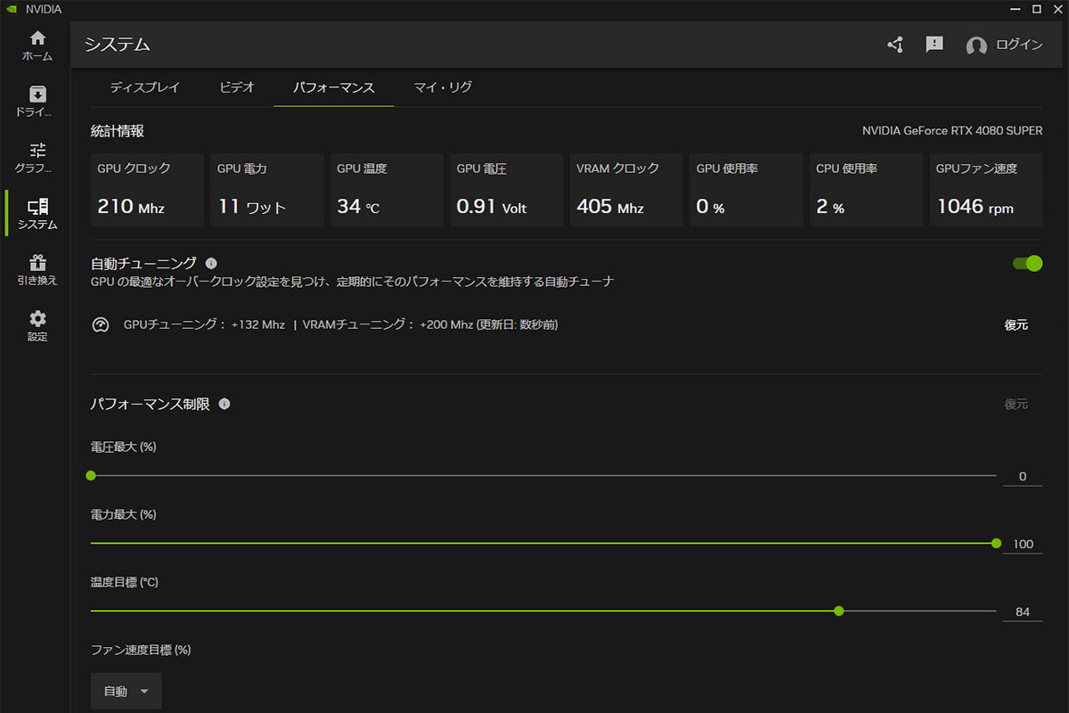 で、昨秋正式版となった NVIDIA アプリには「自動チューニング機能」という