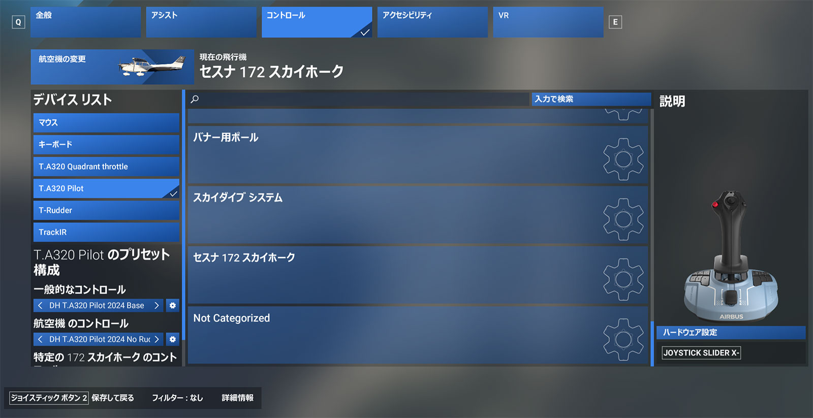 → SimUpdate 2 beta でも変わらず。機能リストの項目を対象プロファイル別に色分けするとか欲しい…… - コントロール設定画面では従来、機種によっては NotCategorized とされていたカテゴリーがあったが、機種名カテゴリーに分類され直された(けれど NotCategorized カテゴリーの残骸がある場合も)