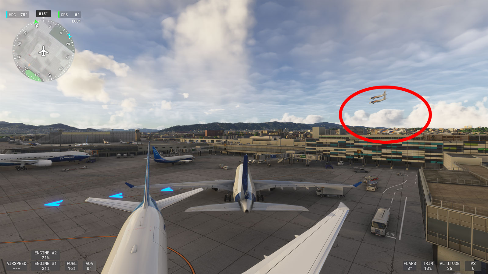 → SimUpdate 2 beta で多少マシになった気がしなくもない(自信なし)。初期バージョンよりはマシになった気はするが、空港でタキシング中に飛行機が突然現れたり消えたりするのは未だ頻出するから、せめて前作 2020 レベルにしてもらわないと……(他の飛行機を表示させないようにすればいいが、それはそれで寂しすぎる) - 駐機している他の飛行機が見るたびに変わる。リアルタイムオンライン設定時に顕著だが、空港で自機の隣りや近所に駐機している機体が観るたびに変わって驚くことがちょくちょく発生。以前も経験はあるが、SimUpdate 2 beta では頻発している。
