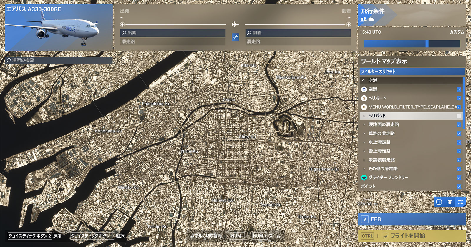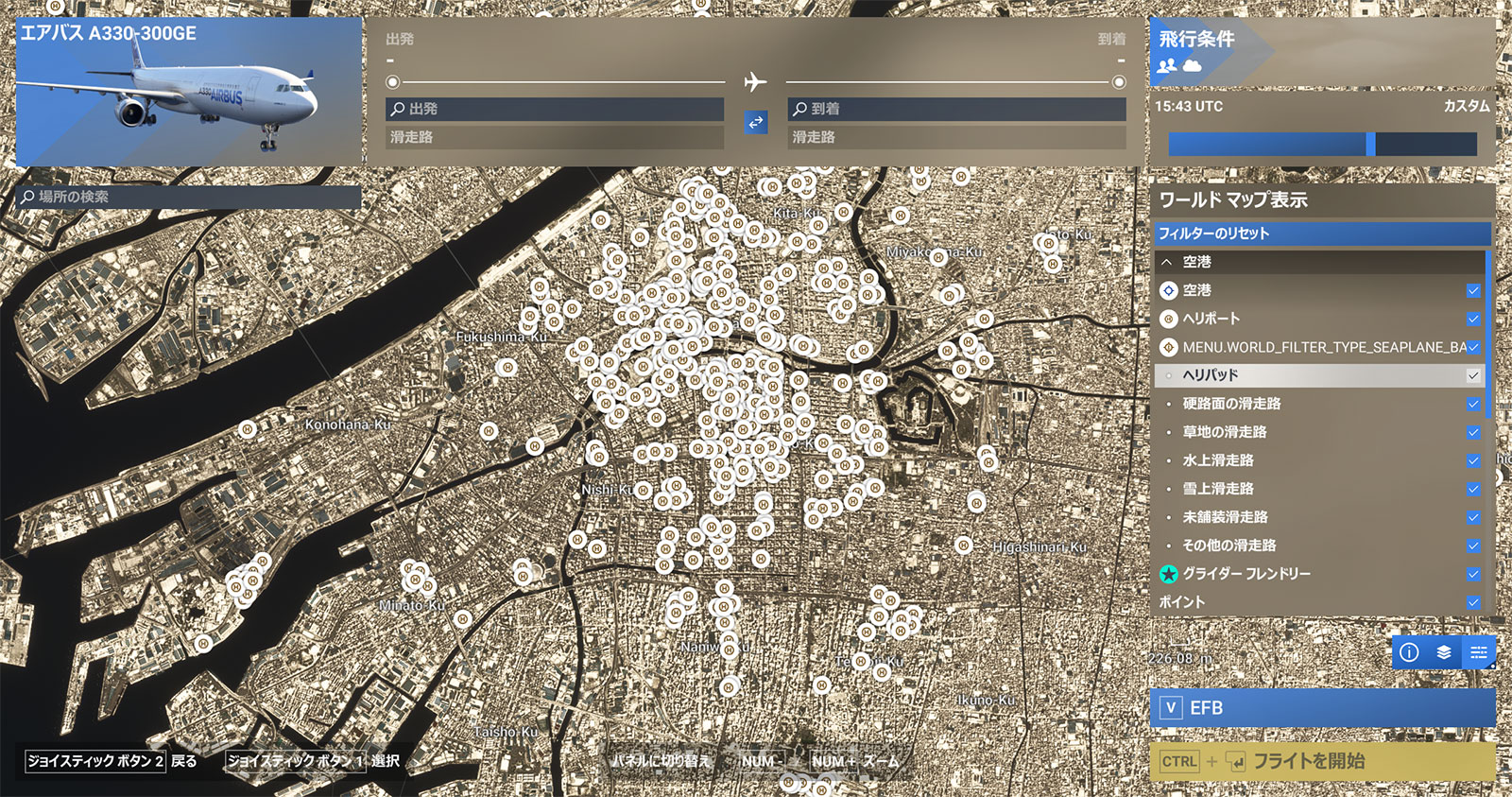 → SimUpdate 2 beta でも変わらず。この程度のことは実装は何も難しくないはずなのに何故しないのか…… - MSFS 2024 になって大量のヘリポートが追加され、地図の空港レイヤーを有効にしたり、フライト時に空港マーカーを有効にすると、日本の都市部では膨大なヘリポートが表示されて非常に鬱陶しいし、ATC で「近くの空港」にコンタクトしようとしても空港にかなり接近しないと選択肢にすら表示されず使い物にならなくなっているので、ヘリポートを消せるようにしてくれ!