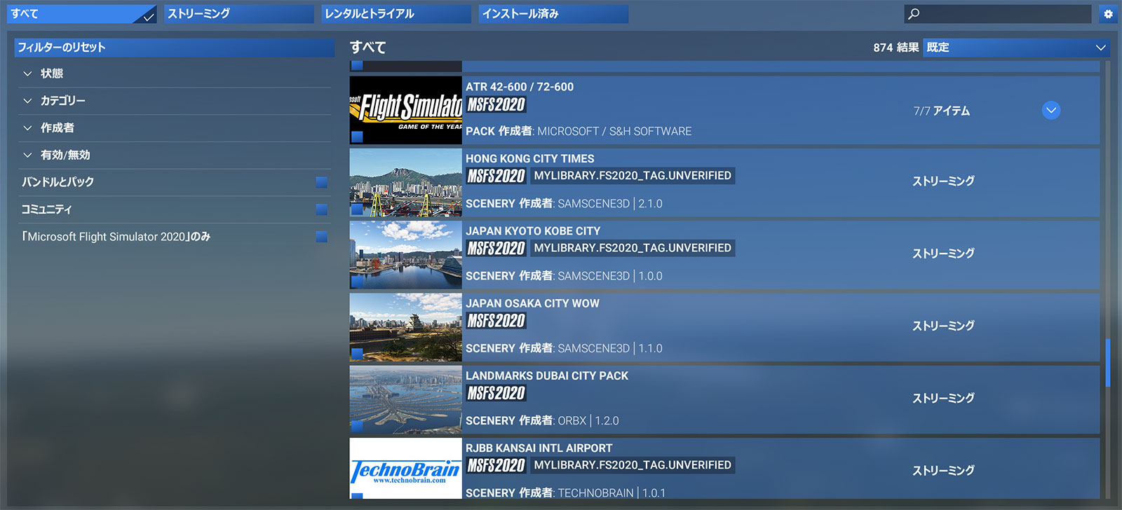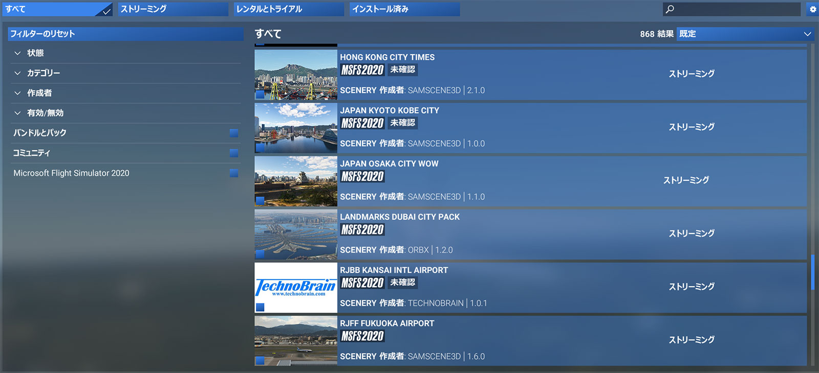 - MSFS 2020 のマーケットプレイスで購入したものは徐々に製作元が MSFS 2024 での動作確認または対応されたようで、「クリエイターが承認されていません」「未確認」ラベルが付いたアドオンは少しずつ減ってきている