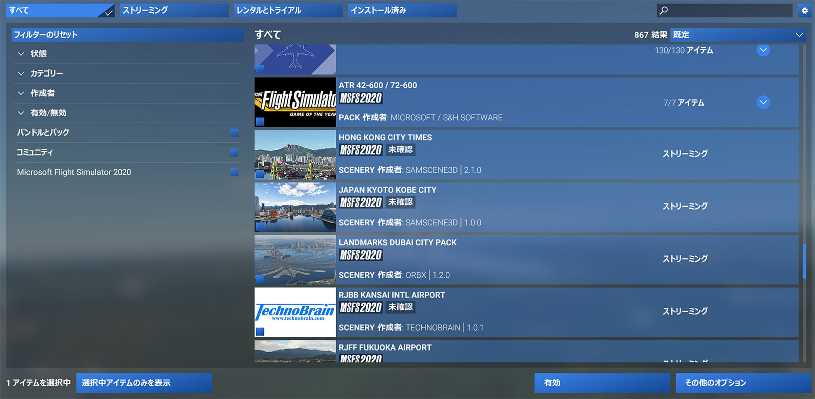 - マイクロソフト純正の有料アドオンとして購入した ATR42/72-600 も「クリエイターが承認されていません」ラベルが付いている時に導入して試すもフライトコンピューターなど一部不具合があったけれど、最近「未確認」ラベルが外れたので試したら問題なくフライトできるようになった(元から怪しい点は MSFS 2020 と変わらないが)