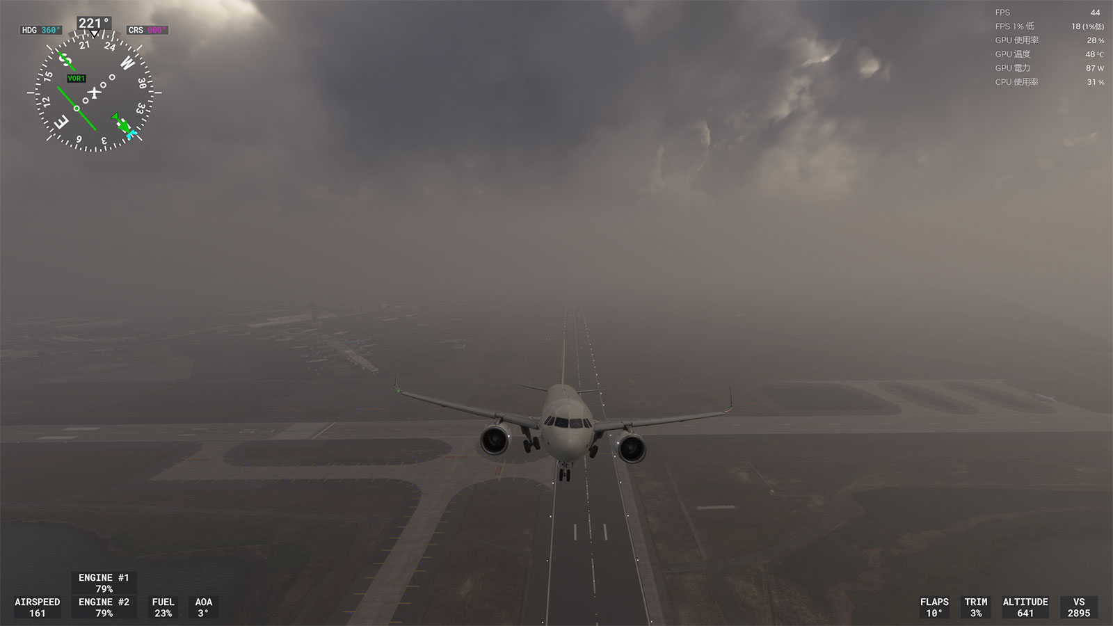 こちらはニューヨークの JFK 空港離陸直後の場面だけど、GPU 使用率 28%、平均 44 fps、最低(1%タイル)は 18 fps。こちらもプレイに支障が出るほどではなかったが、なんで?こんな低いの?であり、GPU 消費電力は 87W しか使われていない。GPU 温度はたった 48℃で冷え冷えであり、サーマルスロットリングの可能性はまずないはず。
