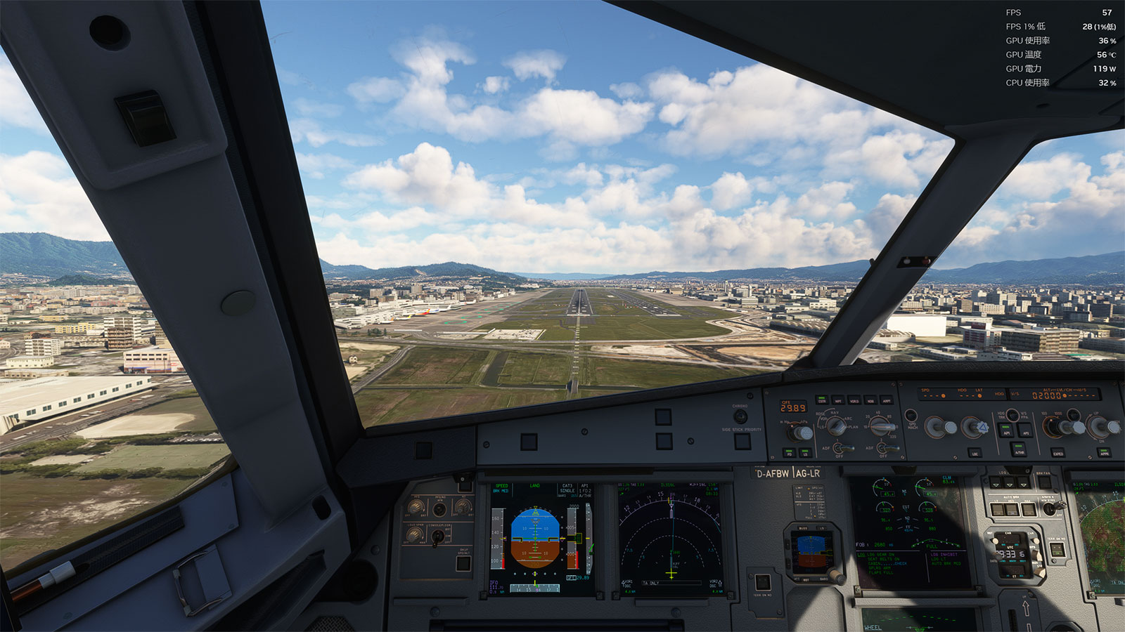 ⬆️上記スクリーンショットのように、都市部の空港へ着陸寸前の、たいていの場合は負荷がかかる条件=GPU使用率も上がり消費電力も上がる場面なのに、GPU 使用率 36%。平均 57 fps、最低(1%タイル)は 28 fps。