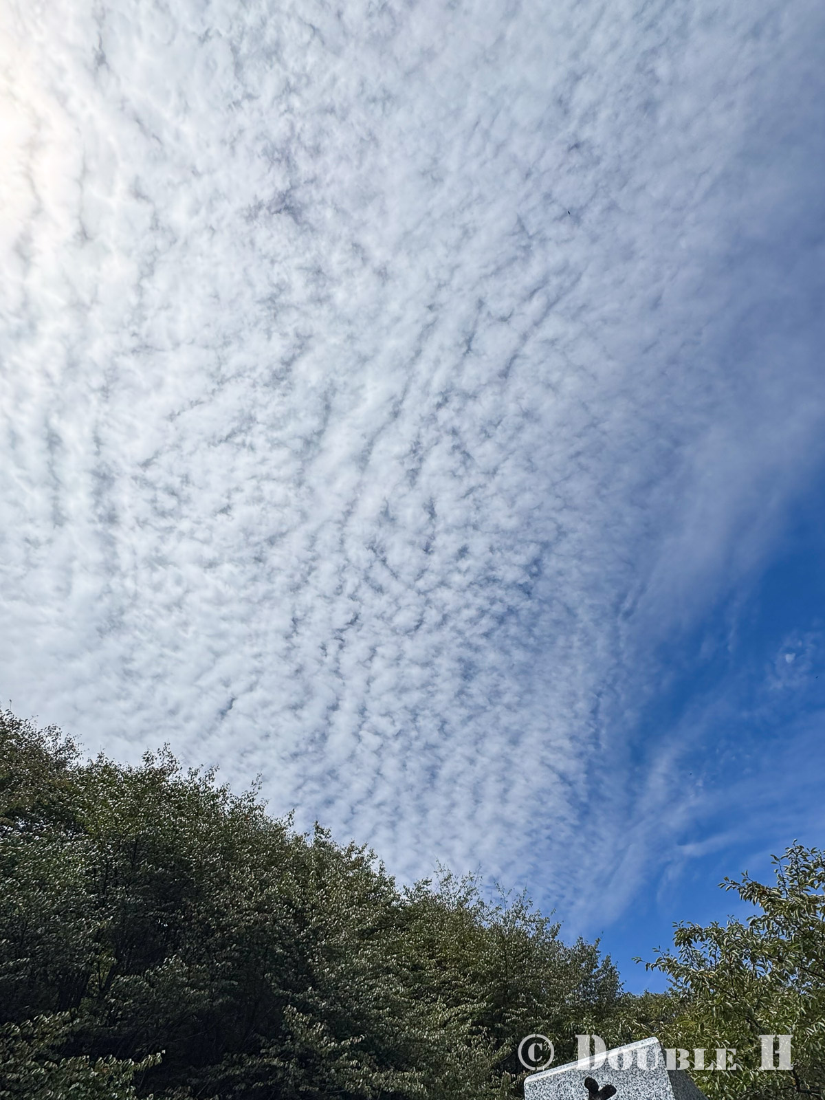 彼岸の空 September 23, 2025 お彼岸ということで家族とともにお墓参り。こういうのは生者の自己満足のためのもの、と思っているが、だからこそ行きたい人がいれば行く。家族も一人欠け、二人欠け、であり、皆んな揃って、というのが、いつまでできるか分からないことは重々承知しているしね…… ふと見上げれば、秋らしい鱗雲。今秋の墓参りの記録写真はそんな空とともに撮っておいた。前回記事に載せたのと同じような写真になっちゃったけど。 「チラシの裏な日々」カテゴリの最新記事 タグ :#墓参り#彼岸#空#雲 < 前の記事次の記事 >