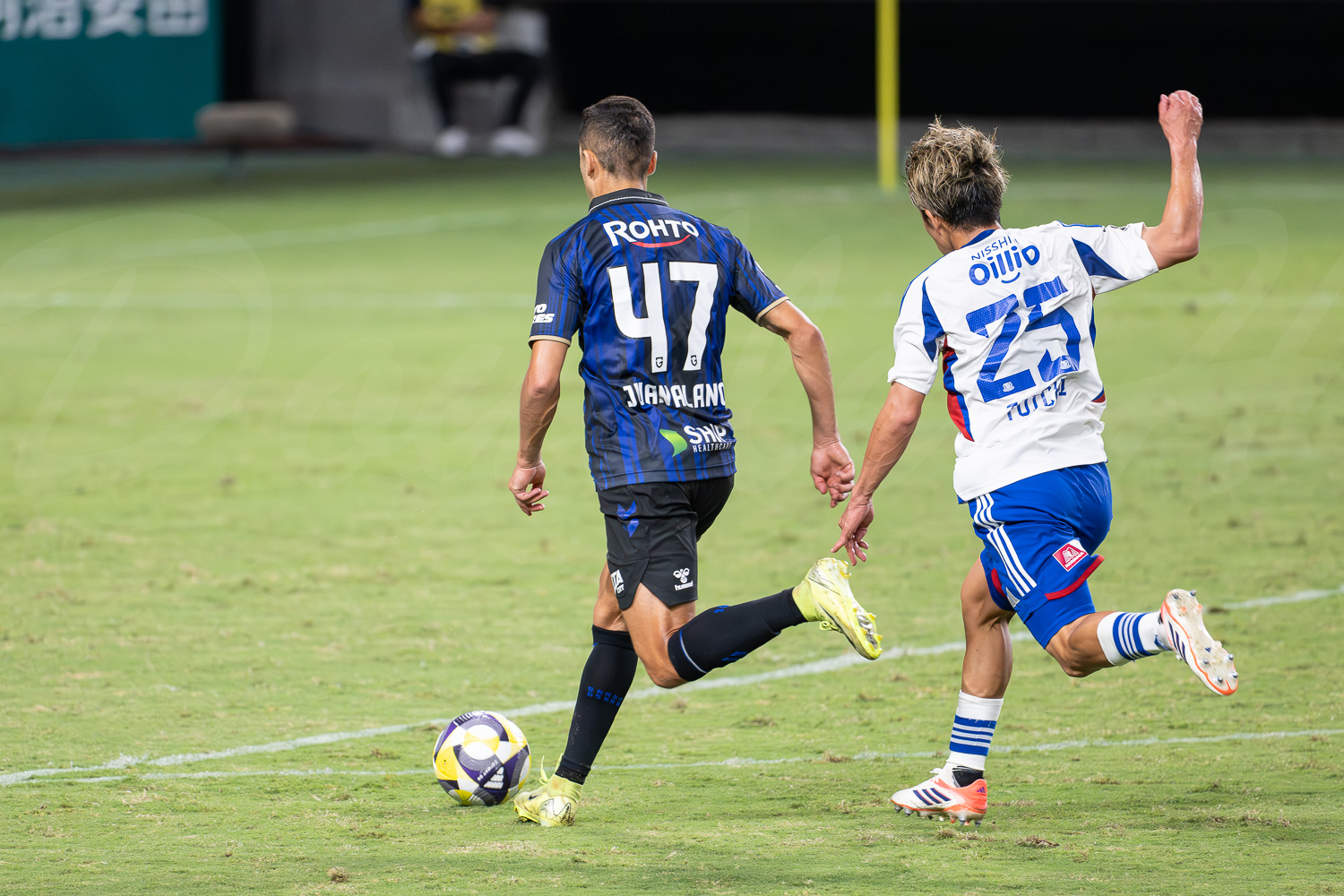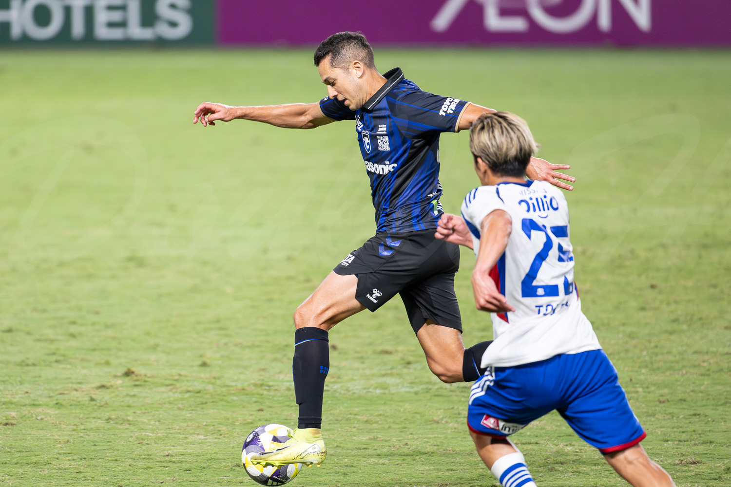 先制されてからギアの上がったガンバ大阪の攻撃、満田選手からサイドのウェルトン選手にパス、そのウェルトン選手がクロスを上げられないと判断して満田選手へ戻す。