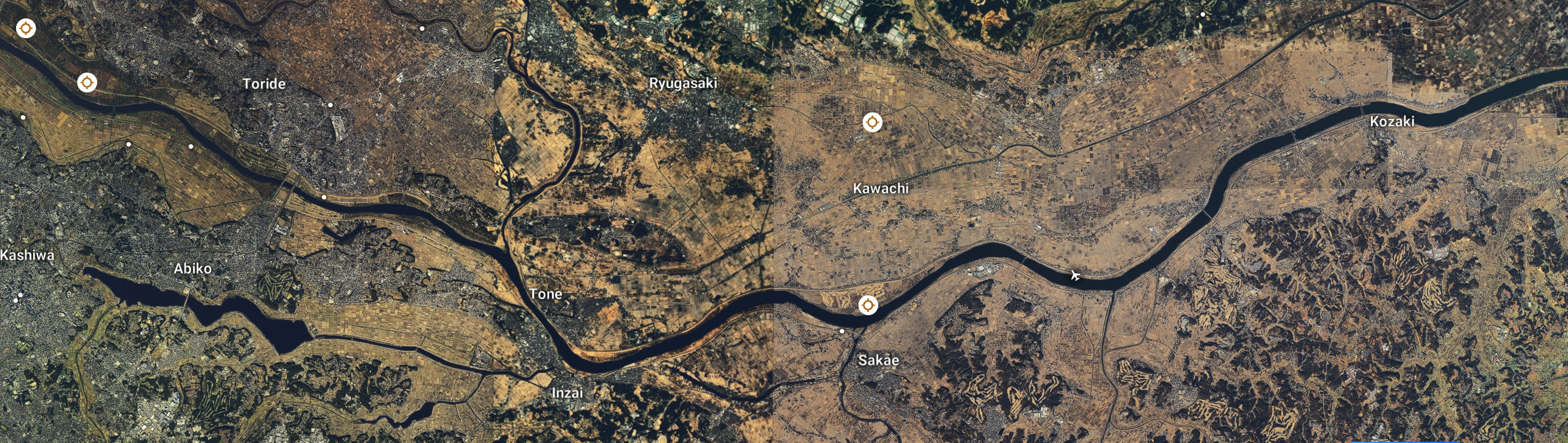 - 常磐線に沿って飛んで、新しくフォトグラメトリによって生成されたデーターに基づいたエリアと従来仕様エリアの境界線を探した結果、取手の先、龍ヶ崎の手前の藤代駅あたり(藤代駅と小貝川の間あたり)が境界線のようです。